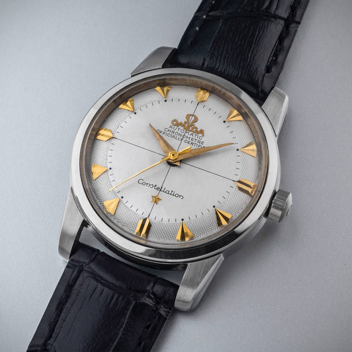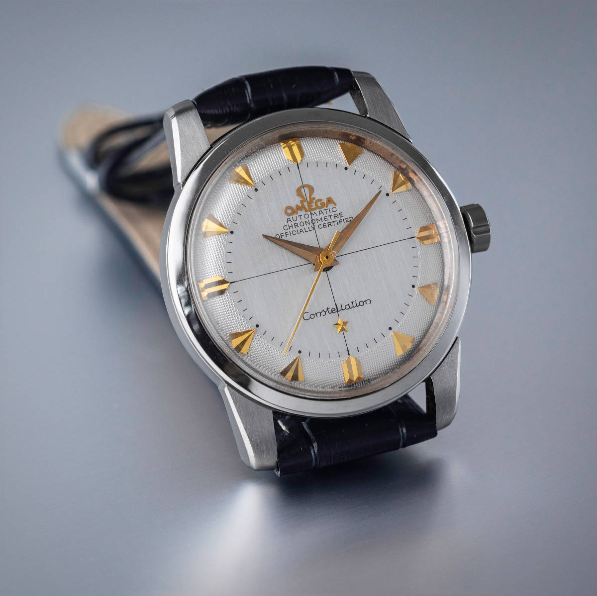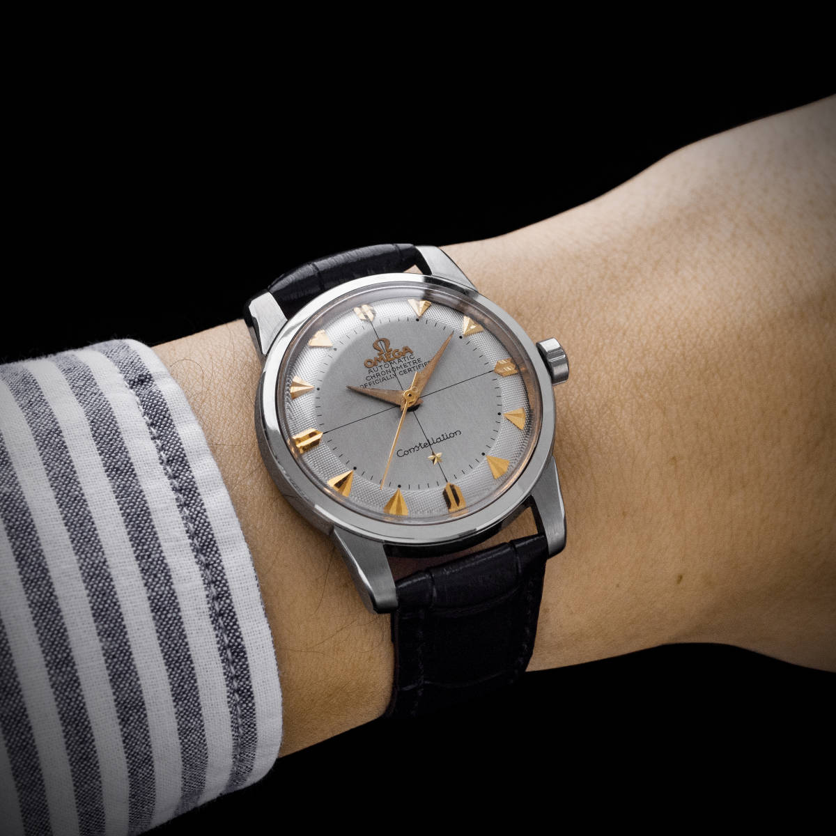 | ※全て現物の写真です。 【概要】 オメガの最高峰機種として当時発売されたコンステレーション、中でも人気の1950年製のオメガ コンステレーション アローヘッド インデックス。 【ポイント】 「アローヘッド」の愛称で人気の「オメガ/コンステレーション/Ref.2849 4 SC」が入荷しました。絹目とシルバーのツートン文字盤に、ハート型のクサビインデックスが目を惹きます。 | |||