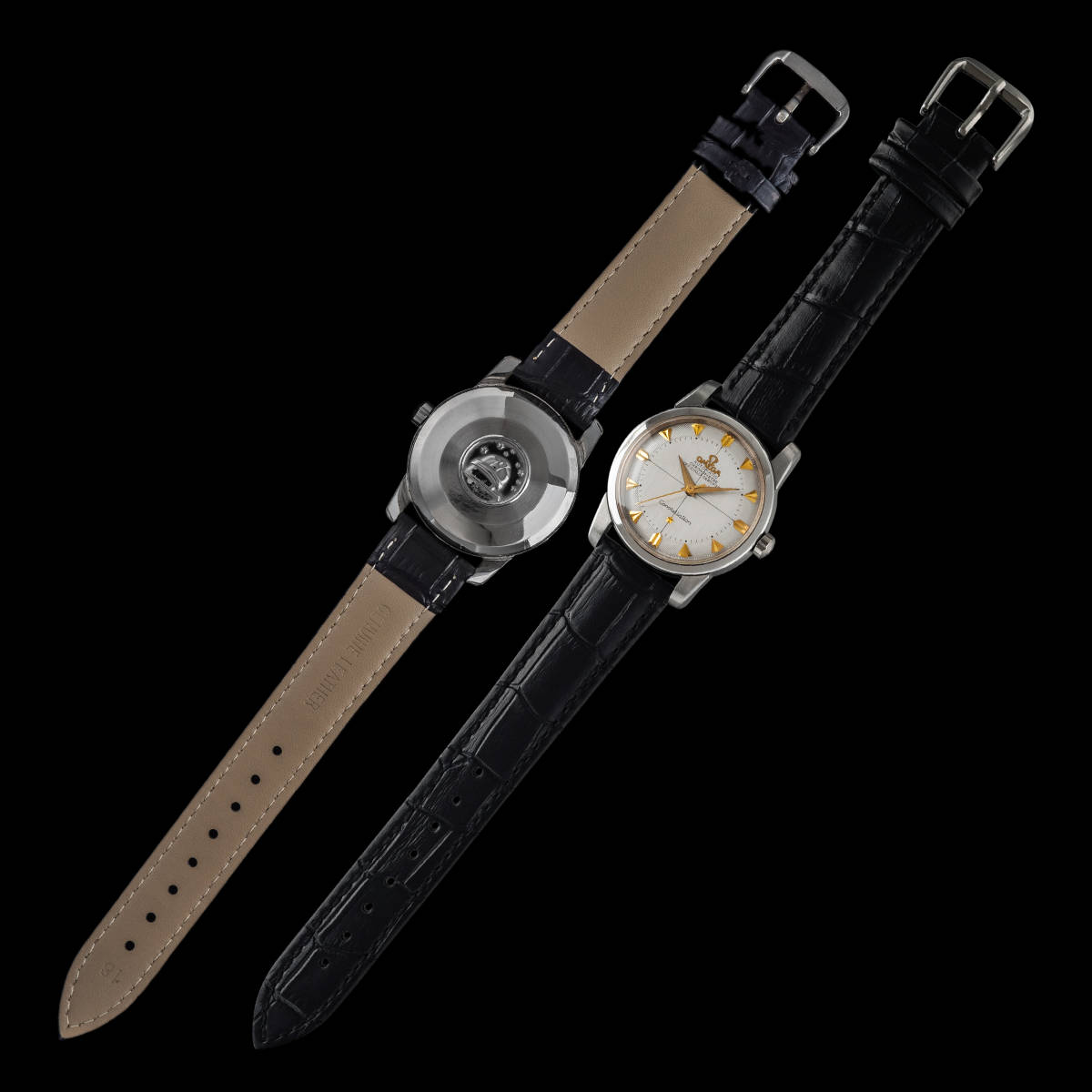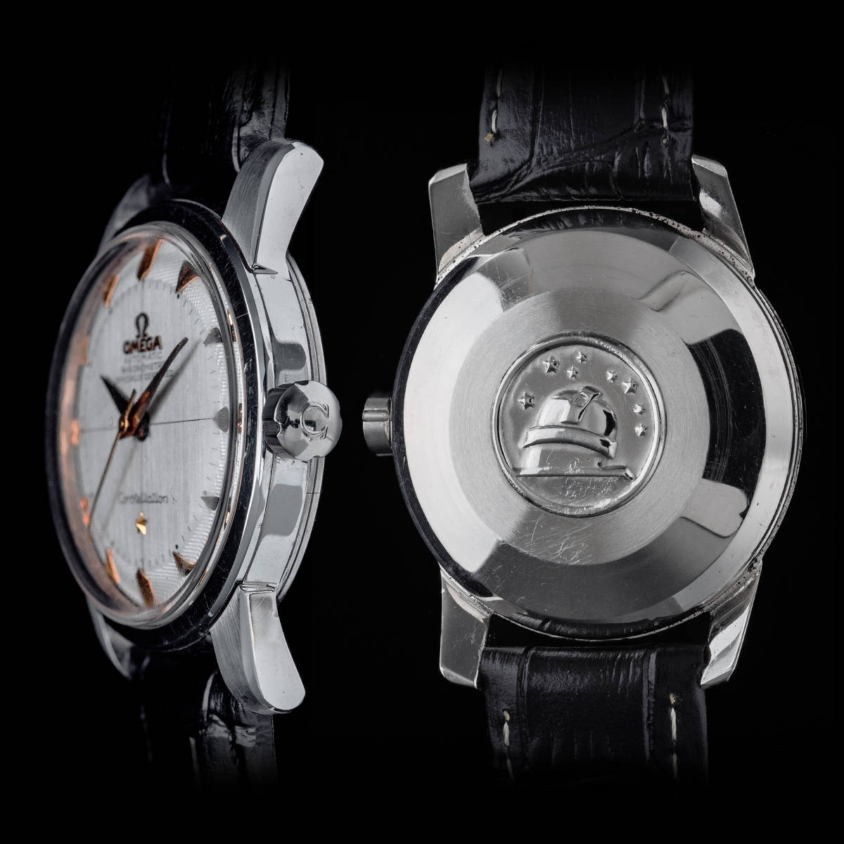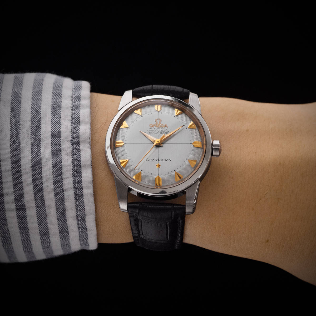 | ※全て現物の写真です。 【概要】 オメガの最高峰機種として当時発売されたコンステレーション、中でも人気の1950年製のオメガ コンステレーション アローヘッド インデックス。 【ポイント】 「アローヘッド」の愛称で人気の「オメガ/コンステレーション/Ref.2849 4 SC」が入荷しました。絹目とシルバーのツートン文字盤に、ハート型のクサビインデックスが目を惹きます。 | |||
