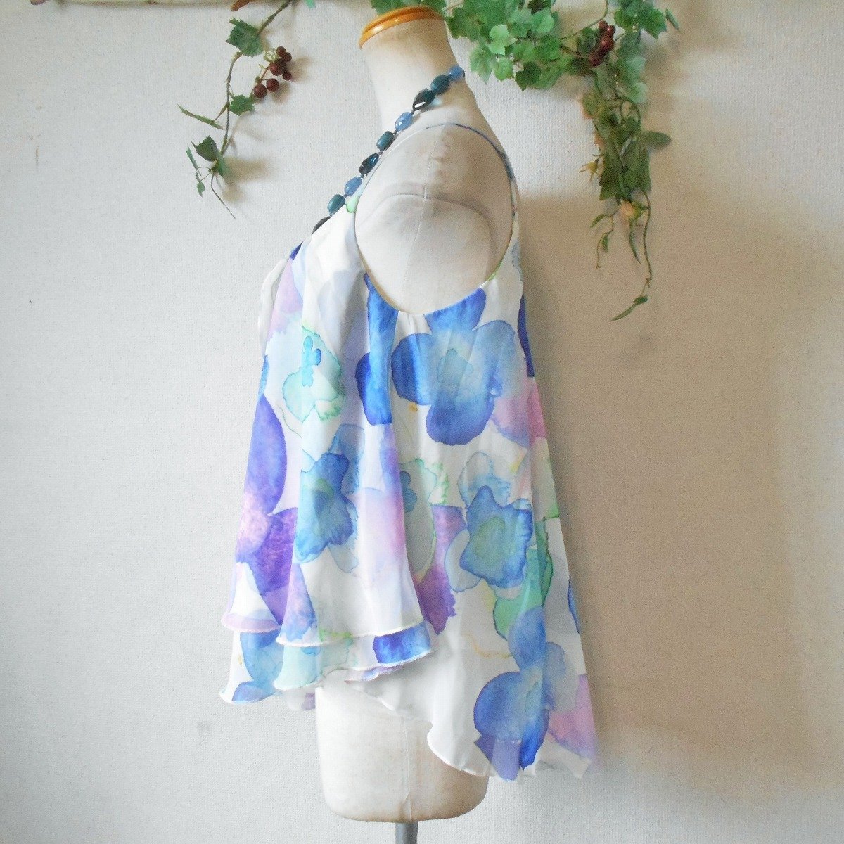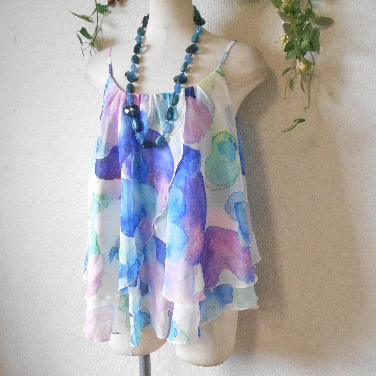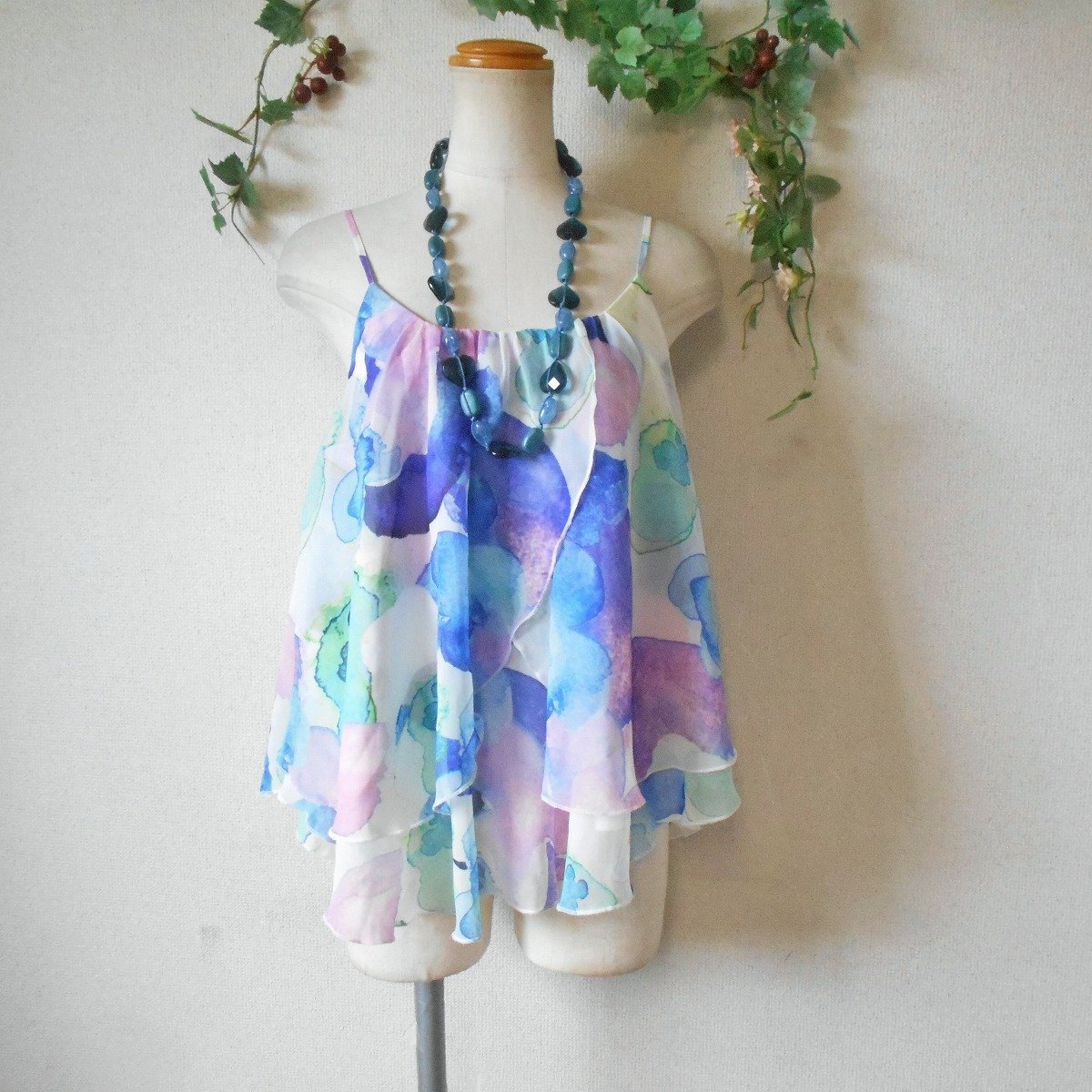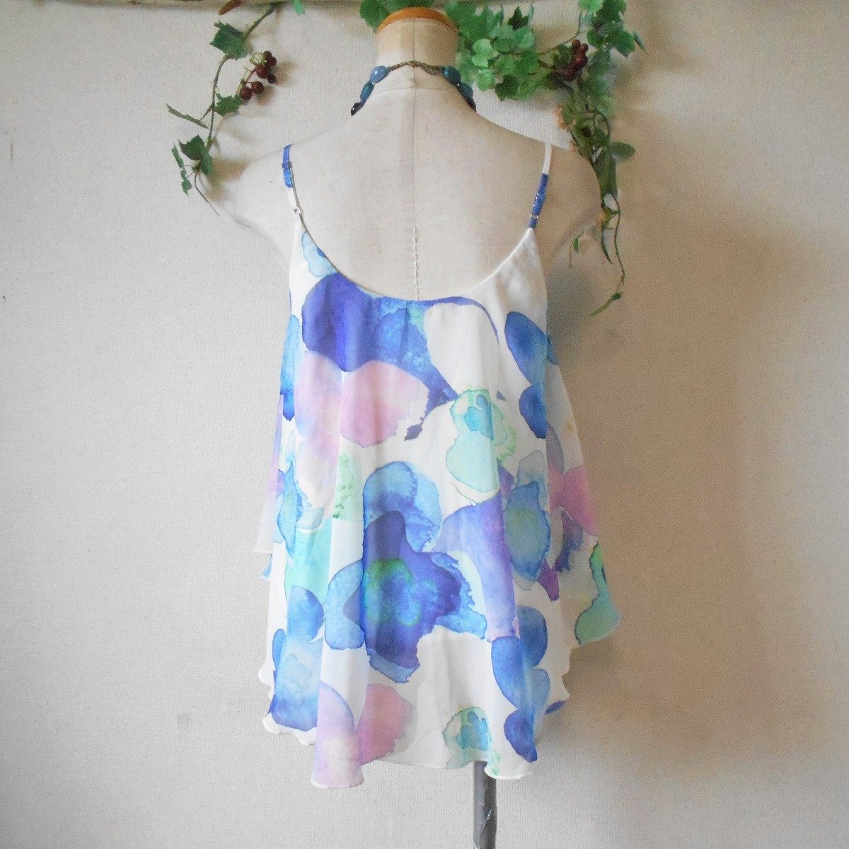 【ポイント】ムルーアのキャミソールブラウスになります。お色はピンクやブルー、等、淡いカラーの多色使用でお花のプリントが入っています。夏らしい涼しげなプリントのとっても素敵な一着です。