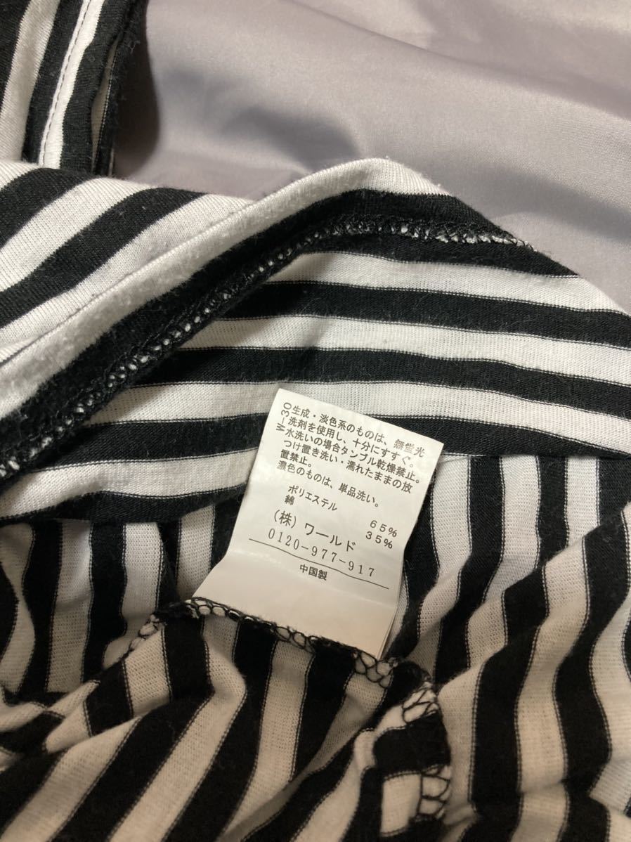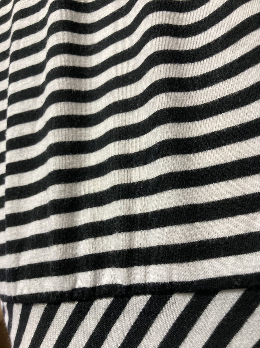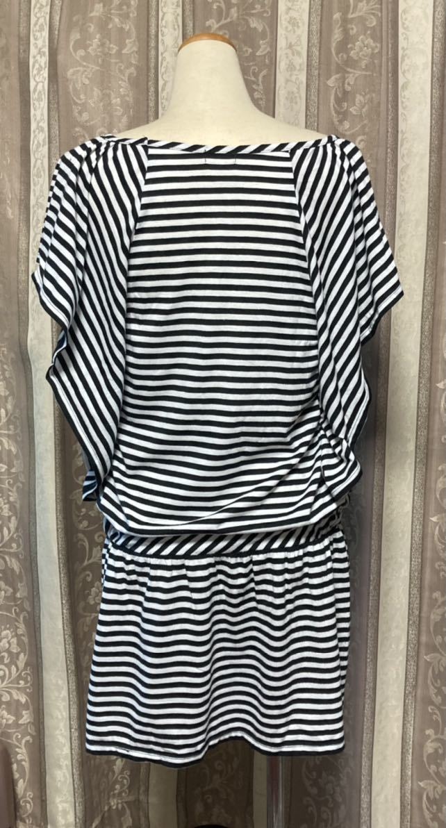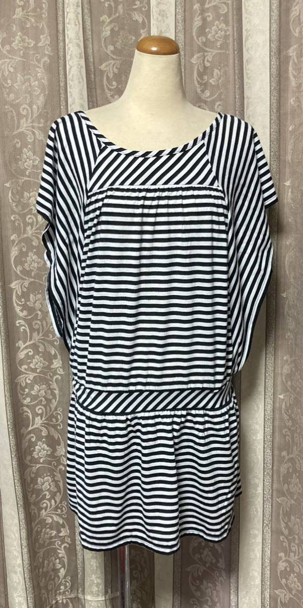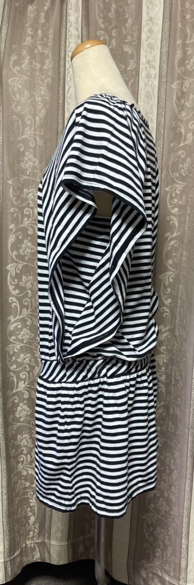 ★USED品★良質日本製ブランド ワールド社製◎HusHusH ハッシュアッシュ◎綿混合生地の抜群ストレッチのヒラヒラ袖が可愛いゴムブラウジングのチュニックワンピL★ボーダー柄★黒白★1シーズン着用分の毛玉と使用感あり。