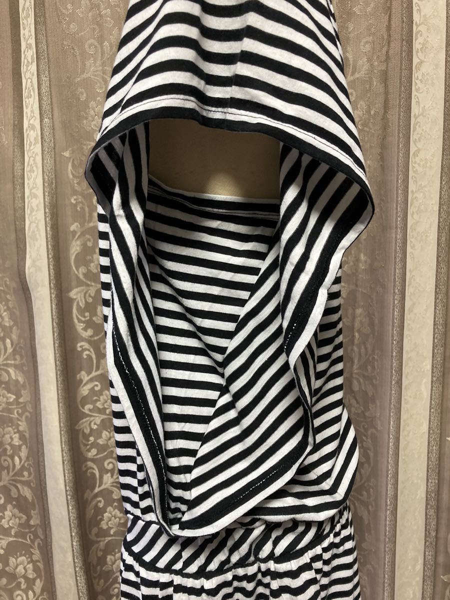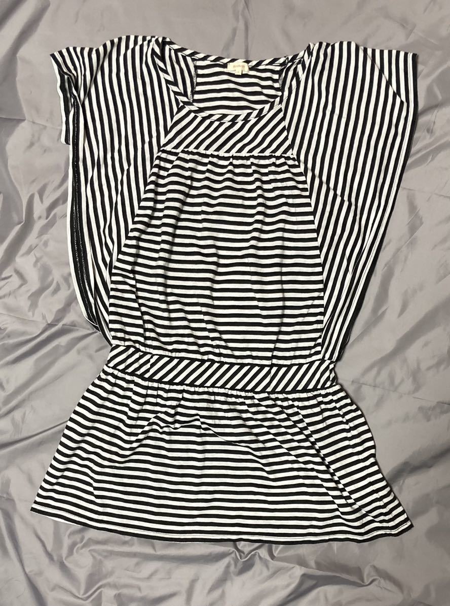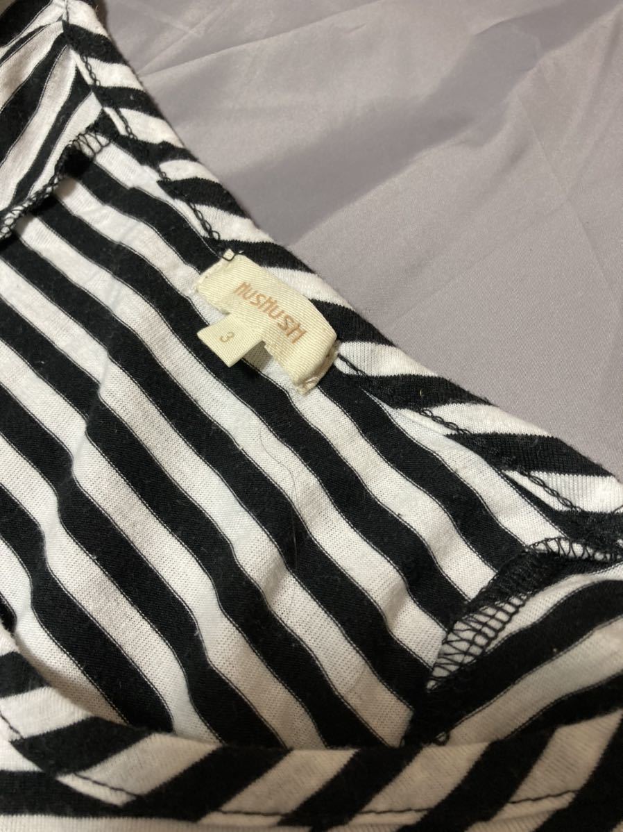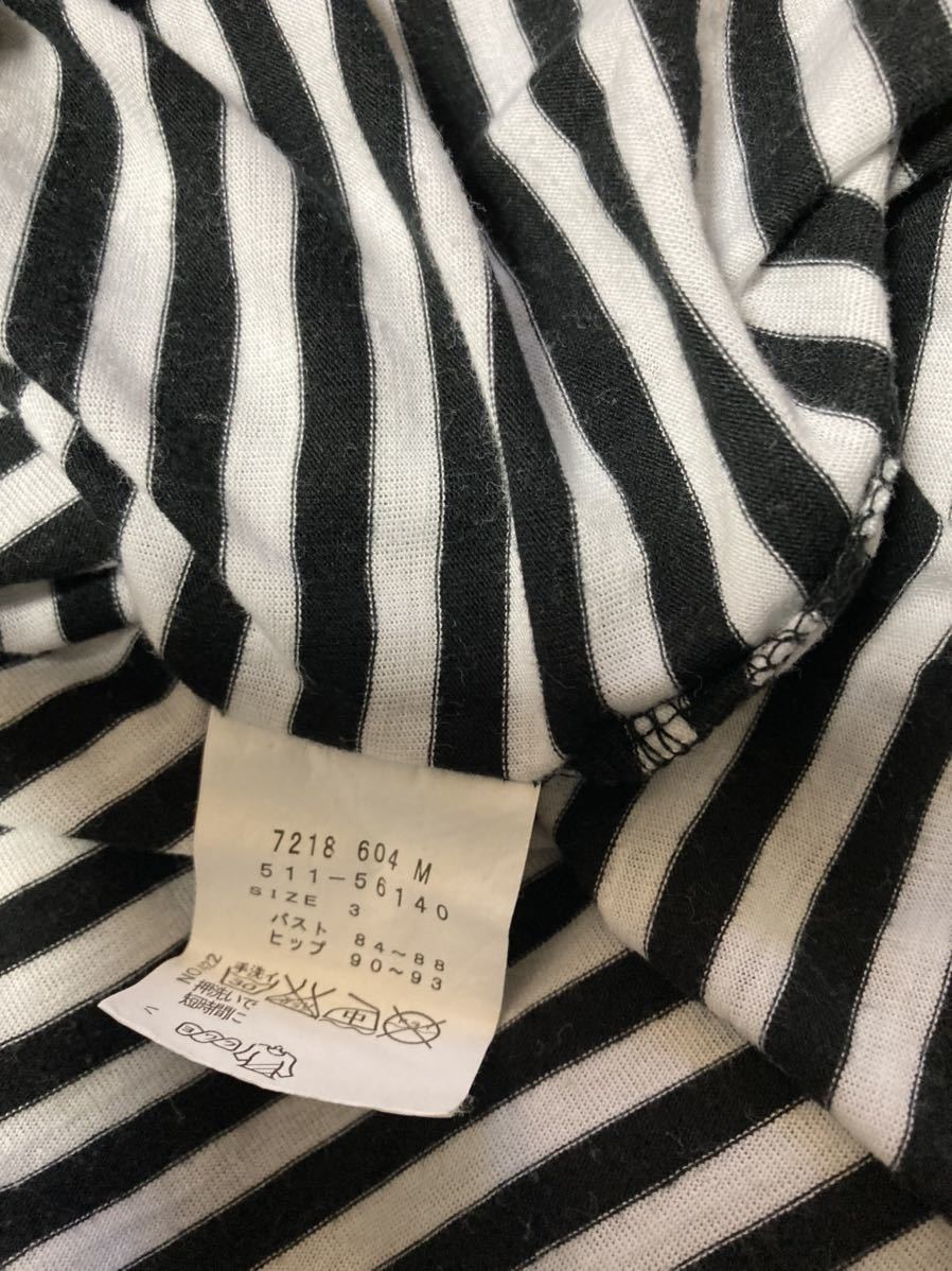 ★USED品★良質日本製ブランド ワールド社製◎HusHusH ハッシュアッシュ◎綿混合生地の抜群ストレッチのヒラヒラ袖が可愛いゴムブラウジングのチュニックワンピL★ボーダー柄★黒白★1シーズン着用分の毛玉と使用感あり。