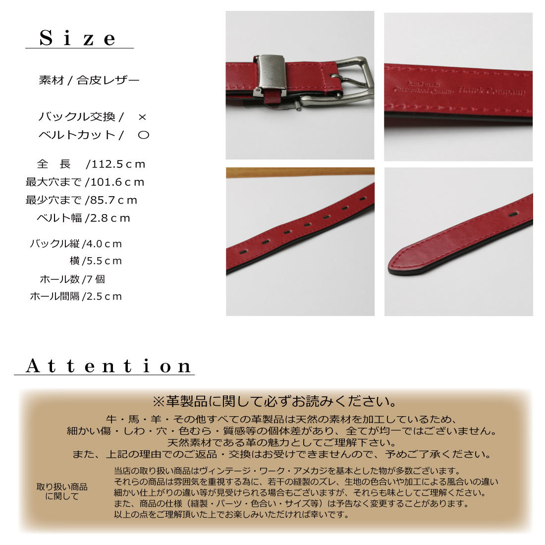 はりのある上質な合皮レザーを使用したベルトが登場。 レザーと同系色のステッチとあわせて、スクエアタイプのバックルが スッキリスマートな雰囲気にまとめています。 シンプルだけど、とても味わいのある雰囲気に仕上がっているので ジーンズなどのカジュアルスタイルだけではなく、 スラックスなどと合わせてもイイですね。 カラーパンツなどに移染しないベルト。 カラーパンツへの移染が気になる方に オススメの合皮ベルトです。 ブランド:ホークカンパニー サイズ: 全長 /112.5cm 最大穴まで/101.5cm 最少穴まで/85.7cm ベルト幅/2.8cm ホール数/7個 ホール間隔/2.5cm バックル縦/4.0cm 横/5.5cm 素材:合皮レザー カラー:ブラック 定価:3080円 【状態】新品未使用品 ※ご注意※ 個人保管の未着用新品になります。 保管の際にケース、外箱にダメージ、汚れ等がある場合が あるかも知れませんのでその分安価にて出品させていただいております。 予めご了承のうえご入札くださいますようお願い申し上げます。 ※特価品となりますので、ノークレーム・ノーリターンにてご理解お願致します。 |