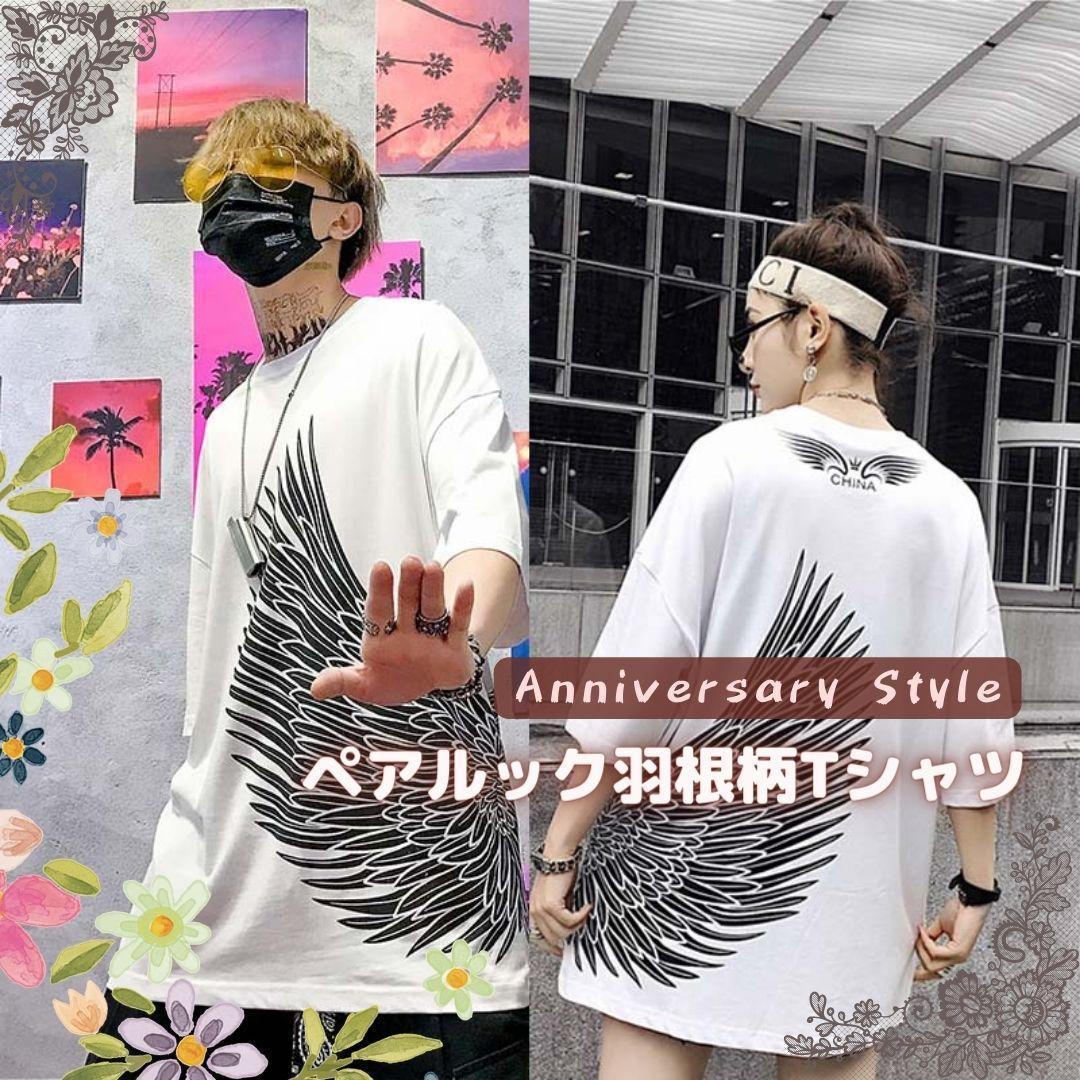 男性と女性のうち一人が後ろを向くと、羽根が広がったように見えるペアルックTシャツです。