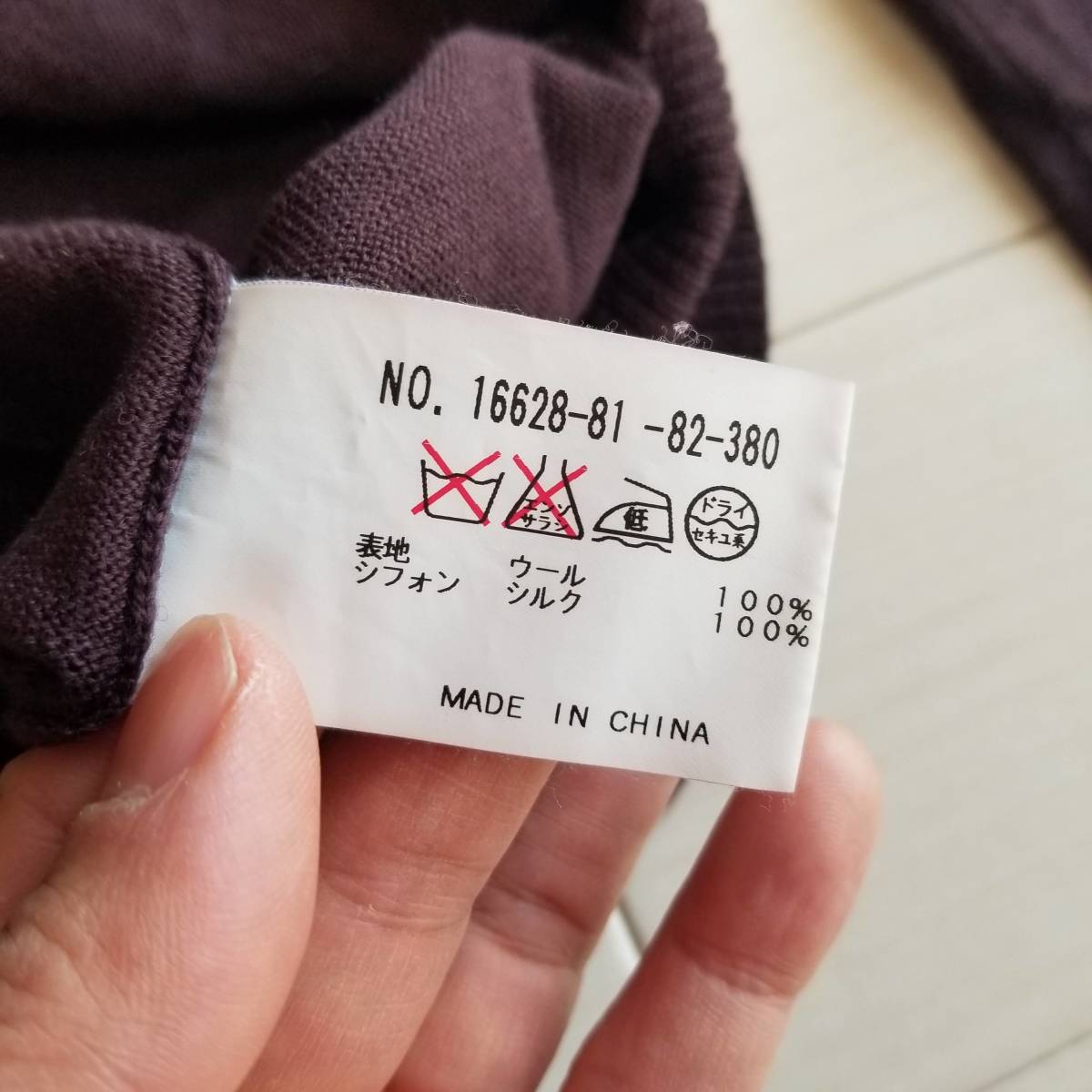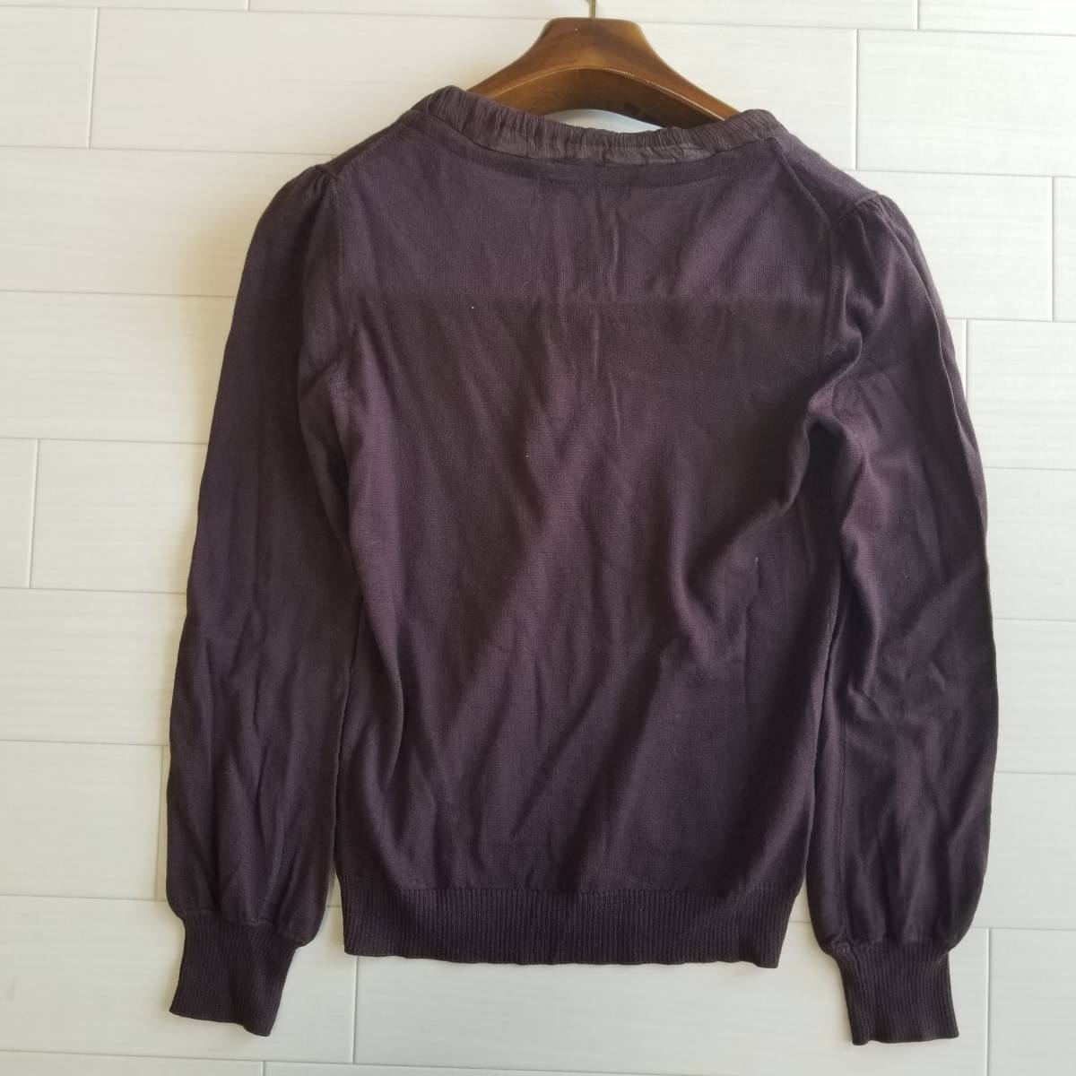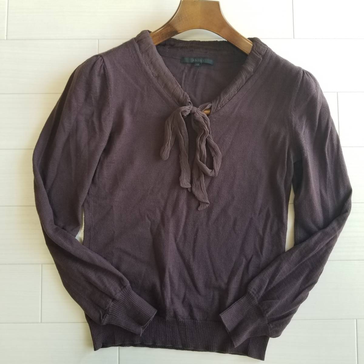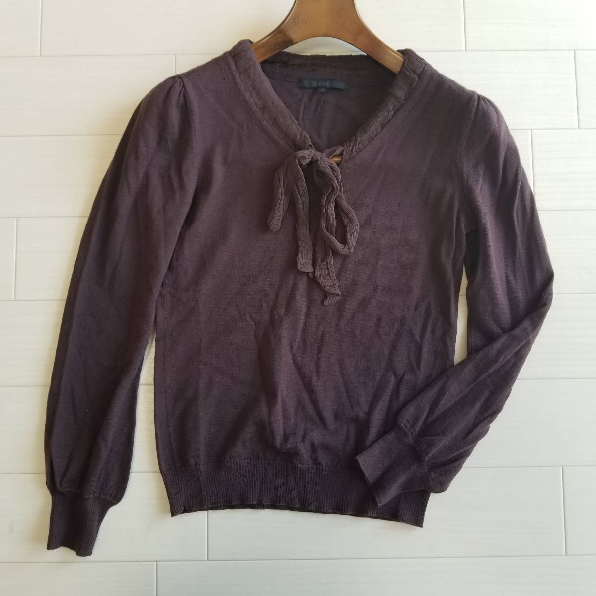 ANAYI アナイ ニット セーター 薄手 異素材MIX シフォンリボン 長袖 リブ フェミニン 女性らしい ウール100% パープル系 サイズ38 a24
