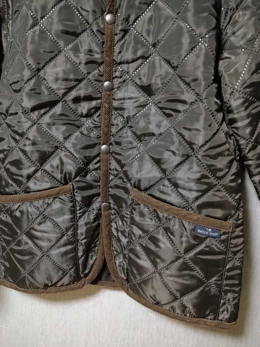 こちらは有名セレクトショップなどでの展開でもお馴染みのブランド、THE SMOCK SHOPのレディース限定キルティングジャケットになります。 定価16590円でした。 日本正規取扱店のボーイズのタグが付いた品で、サイズはメンズのXSの表記で肩幅37、身幅47、着丈は襟上から67の寸法になります。 素材は表地がポリエステル100%のナイロンキルティング生地で、内側は暖かいフリースライニングになります。 色はダークブラウンです。 着用は6回のみですのでこれといった目立つ汚れやキズなどはありません。 画像でも確認できるように、特徴的なキルティング模様、端部のコーデュロイパイピング、ブランドネーム刻印入りスナップボタン、ブランドネーム布タグ、ポケット付きなど、さりげないデザインが大変オススメです。 今回格安からのスタートになりますので、お早めにどうぞ。 お支払いはかんたん決済にてお願い致します。