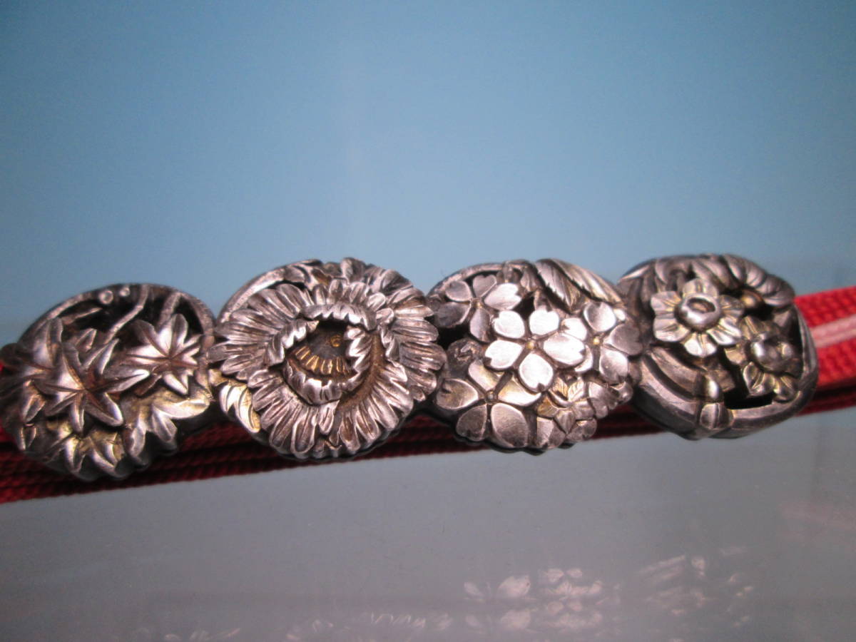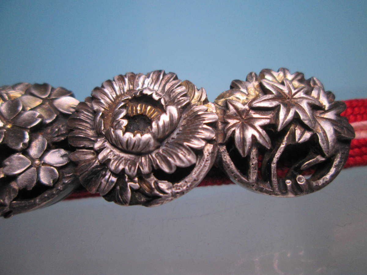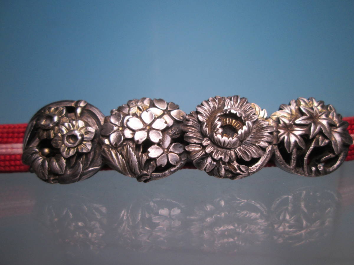【江月】アンティーク・一正作 彫金細工 桜牡丹水仙紅葉の帯留め 22g 木箱付