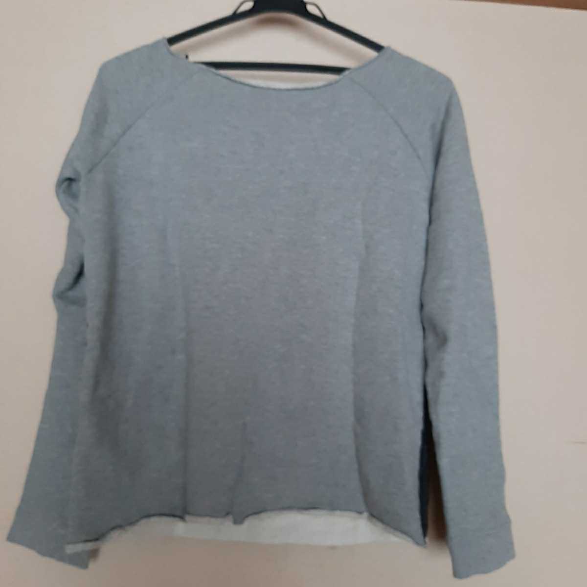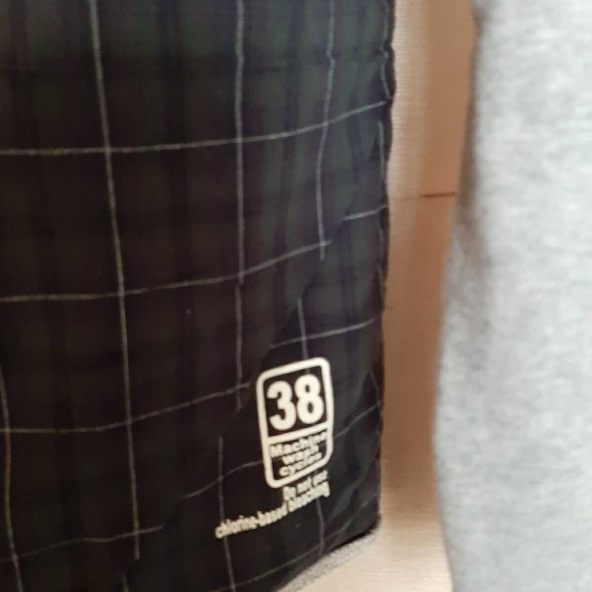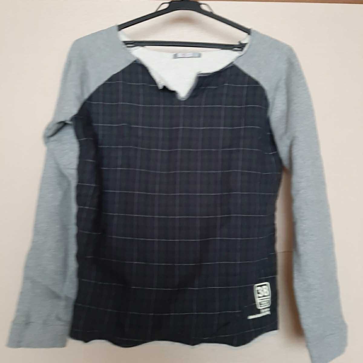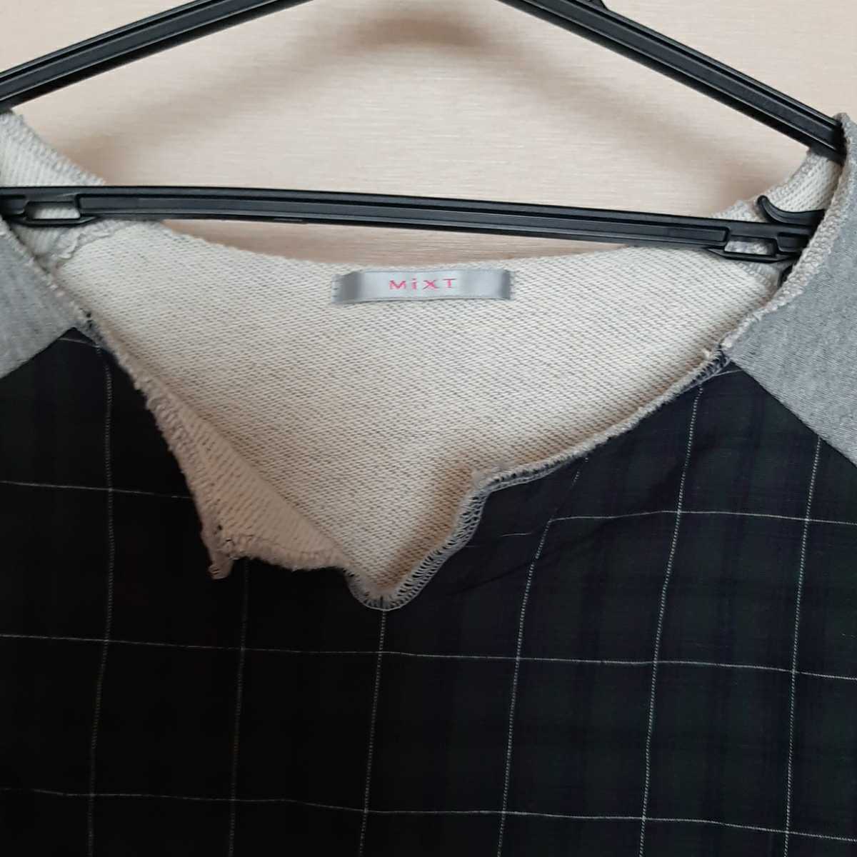 ベルメゾンのMixTブランドのグレーにグリーン系チェック生地使いの切りっぱなしのトレーナー*