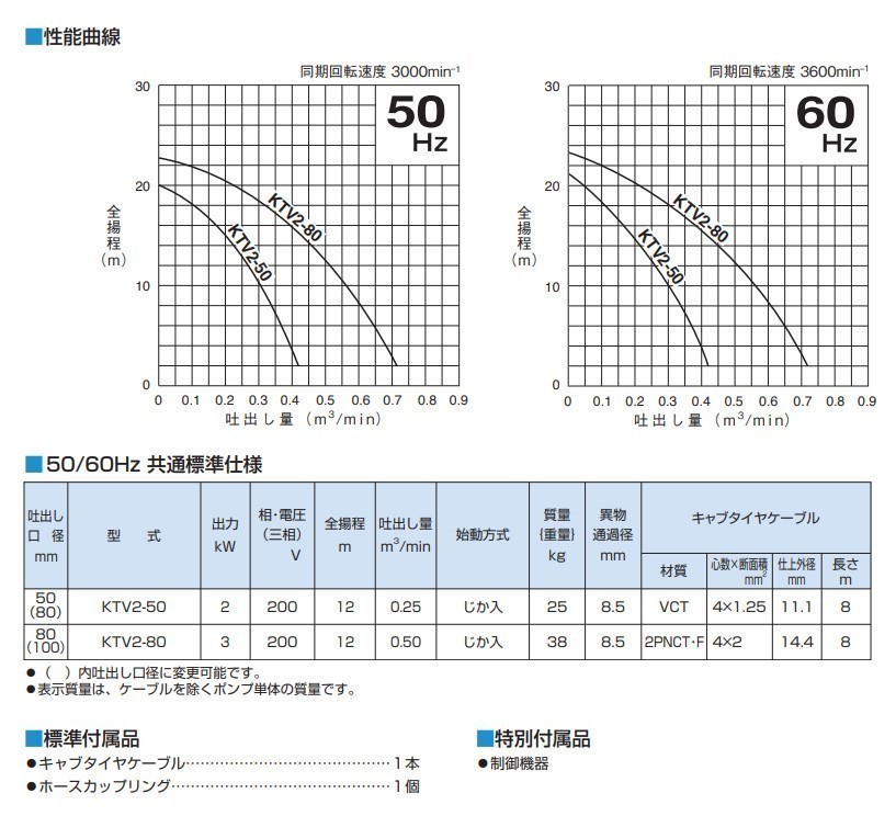 【商品詳細】 【ツルミ 水中ポンプ KTV2-80 サンド用 水中泥水ポンプ 】 出力/相・電圧: 3kw / 200V 全揚程/吐出量: 12 / 0.55m3/min 始動方式: じか入 質量{重量}:38kg 異物 通過径 :8.5mm ●一般工事排水用の KTV型をベースに、ハイギャップ構造のハイスピン形羽根車の採用で、さらに摩耗に強くなり、 砂などの〈ロック〉を少なくした、ハイグレードなポンプです。●耐摩耗・耐久性・軽量性をより重視し、アルミダイカスト部分を 殊合成ゴムで被覆し、充分満足いただける仕様としました。 ●ポンプ下部はボックスレンチ1本で簡単に分解でき、メンテナンスも一層容易になりました。 ●強制撹拌により、泥水・安定液・スライムなどを強力に揚送します。 ■写真は、イメージです。 メーカーホームページはこちらから株式会社鶴見製作所 こちらの商品は法人様のみ車上渡し元払いになります。 個人様は、運送会社様の営業所止めになります。 ※下記注意事項の確認をお願いいたします。