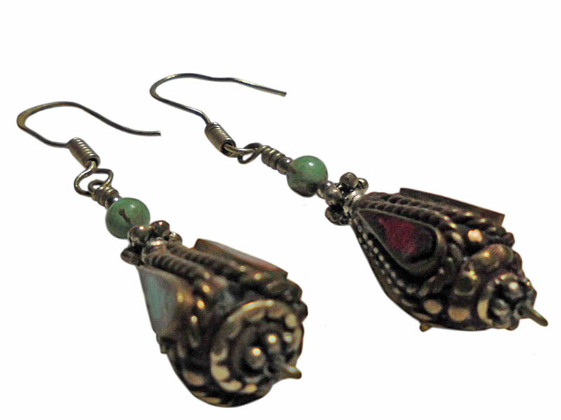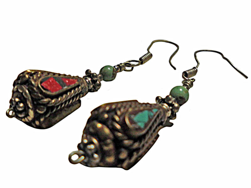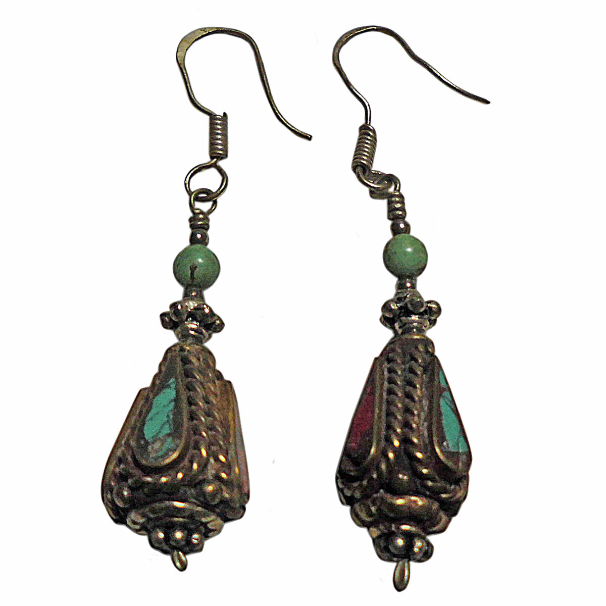 ■☆アジアン雑貨 ネパール銀職人 天然石メタルピアス 山サンゴ・トルコ石 (MTP-43)