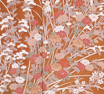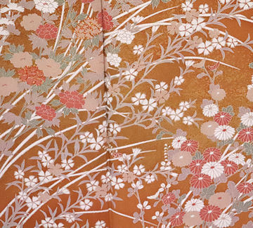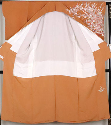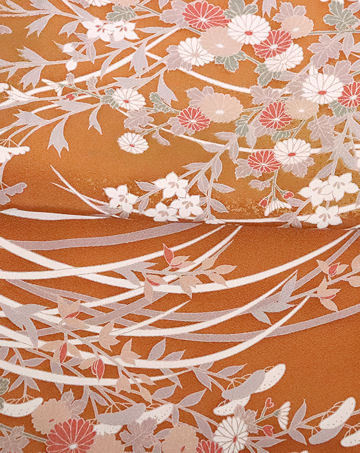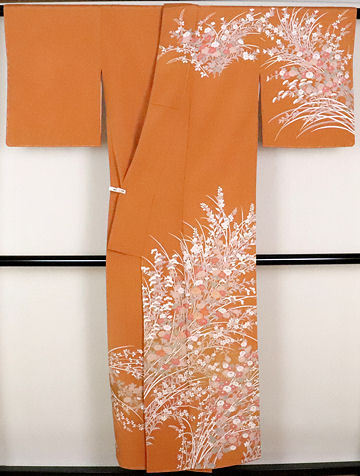 | 色・柄 | 十三参りに 友禅訪問着 袷 濱縮緬地 橙色色地四君子 菊・牡丹・松竹梅・蘭・萩・桔梗・金コマ刺しゅう入り (写真では上手く色が出ない場合があります。ご了承下さい) |