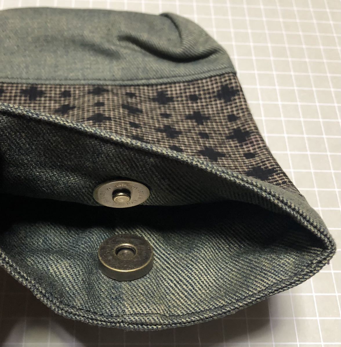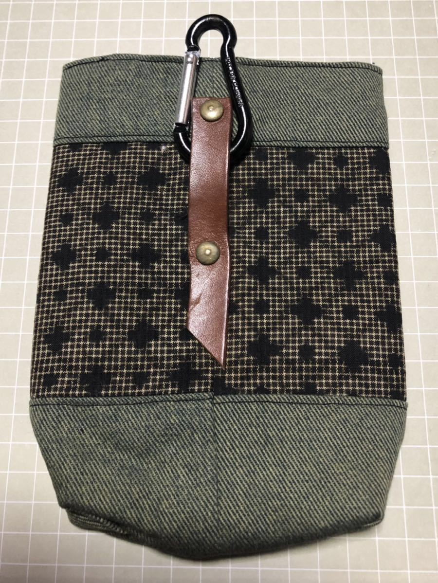 素材:デニム生地、着物生地、本革皮、マグネットボタン、カラビナ。
