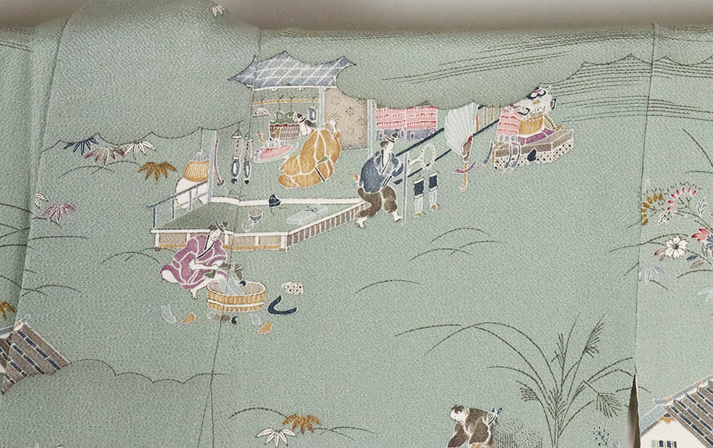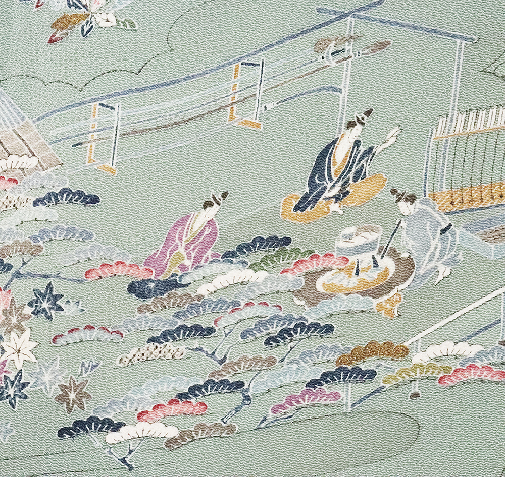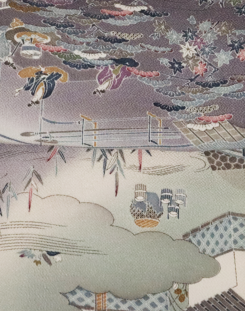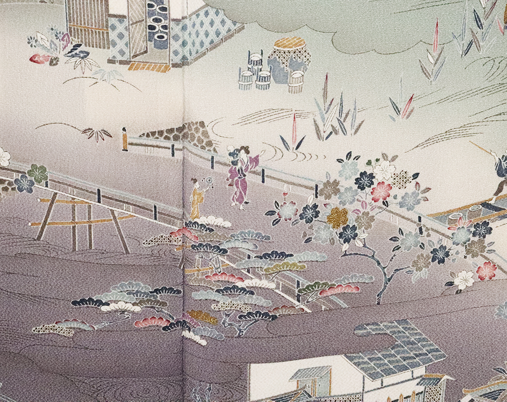 | 色・柄 | 縮緬訪問着 袷 丹後縮緬地 緑・紫ぼかし地 町屋風景 松竹梅 船宿・武具製造 (写真では上手く色が出ない場合があります。ご了承下さい) |