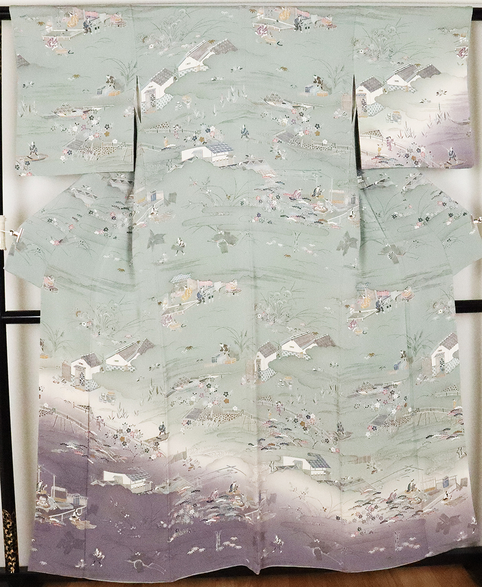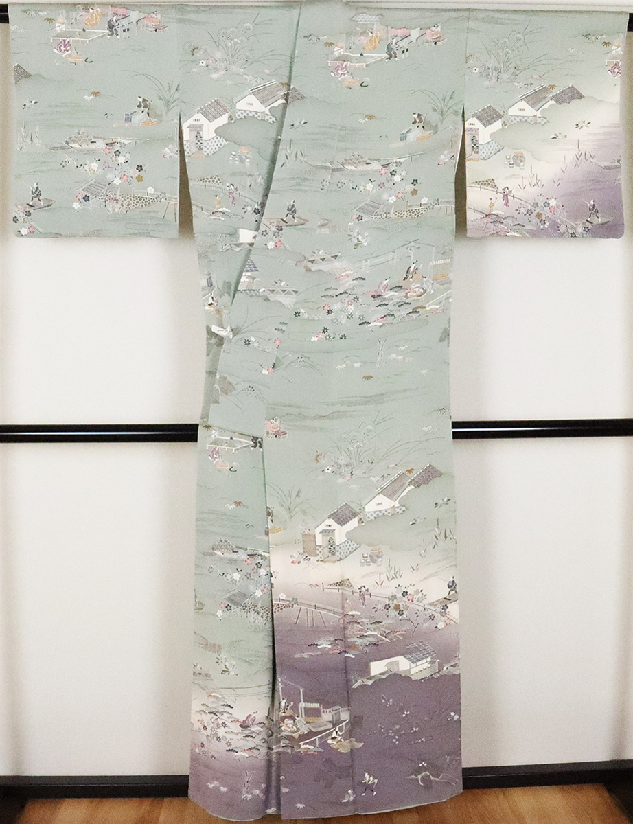 | 縮緬訪問着 袷 丹後縮緬地 緑・紫ぼかし地 町屋風景 松竹梅 船宿・武具製造 164 広襟 | |