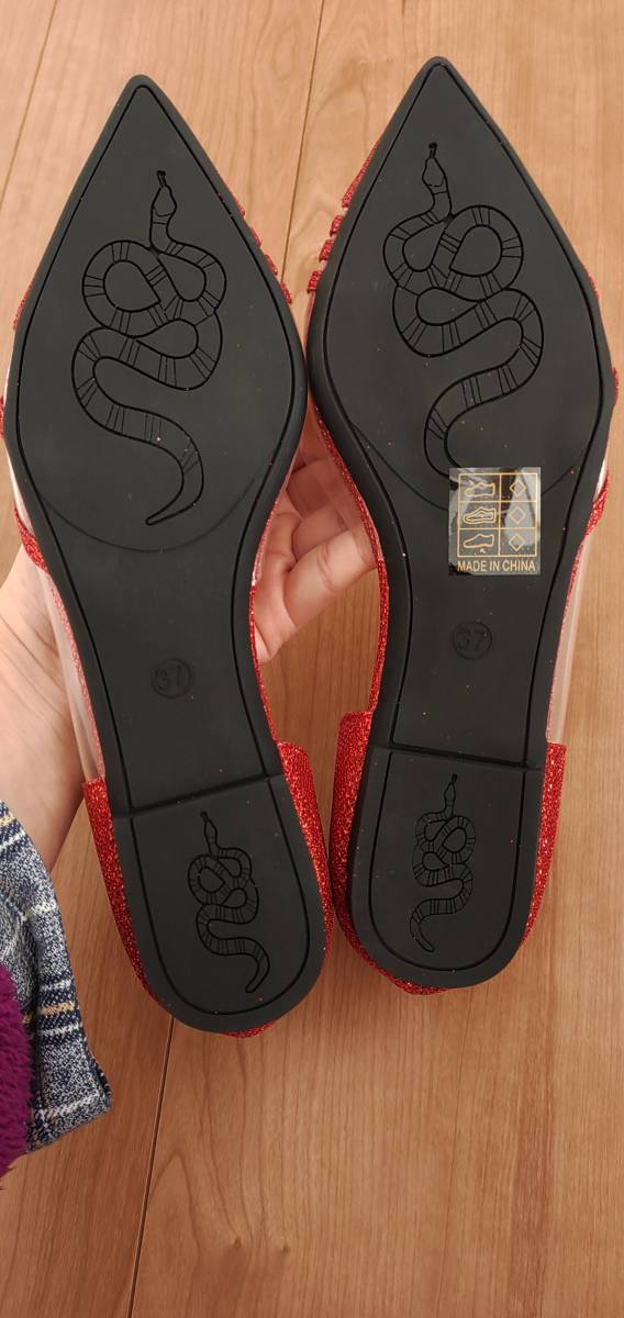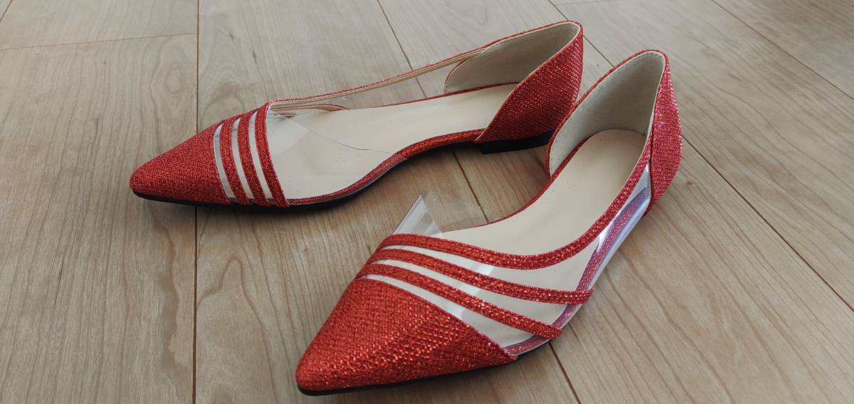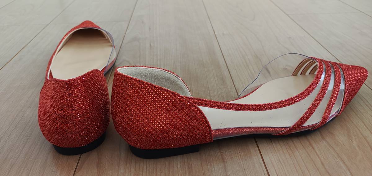 新品 ラメレッド クリア デザイン ぺたんこ パンプス 37 です。