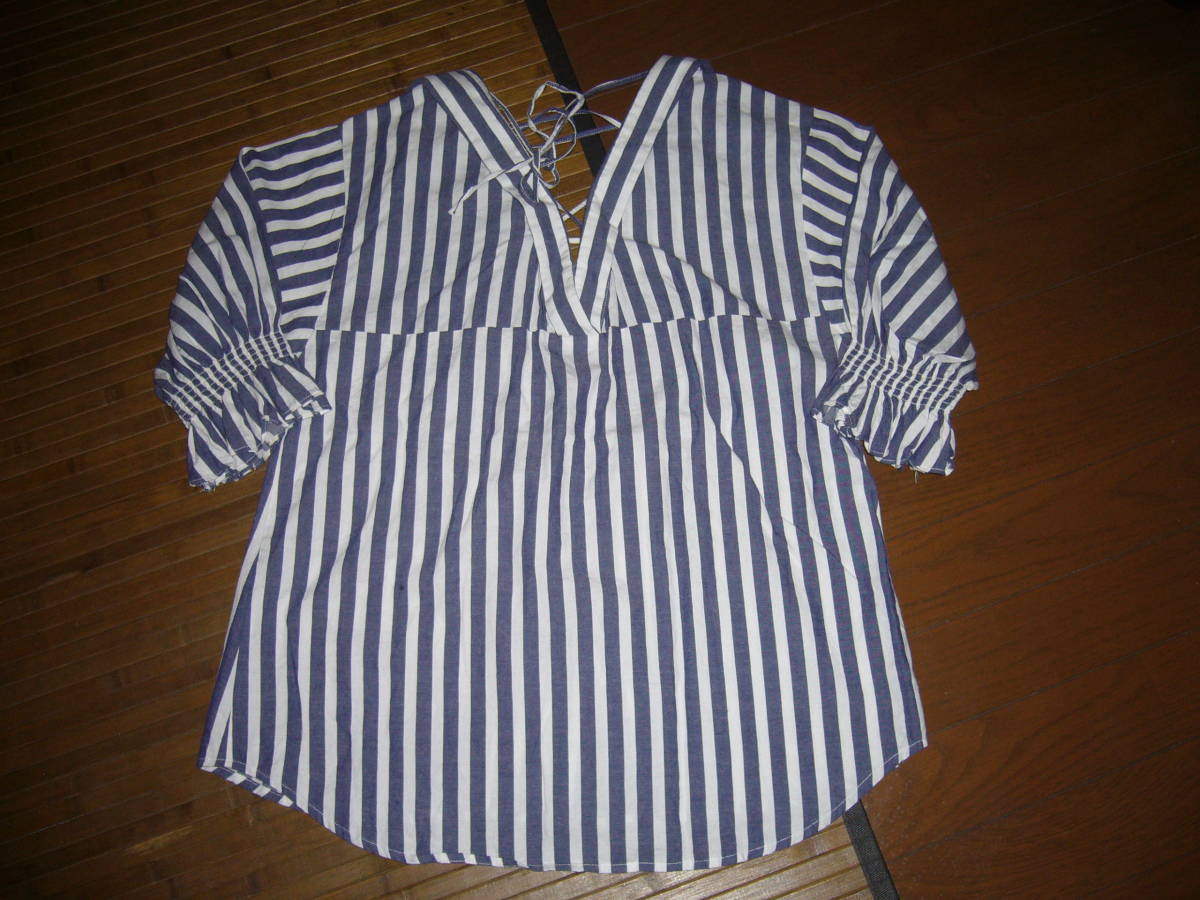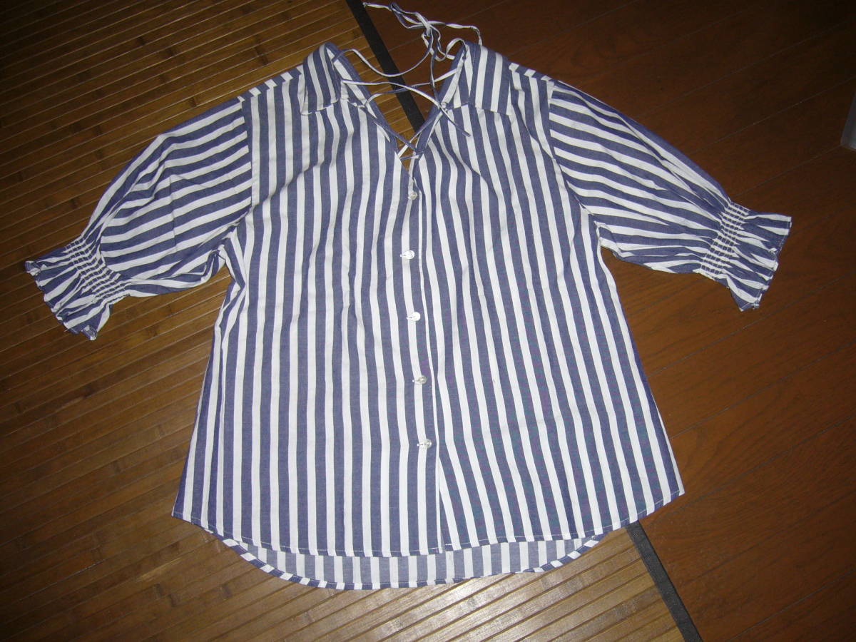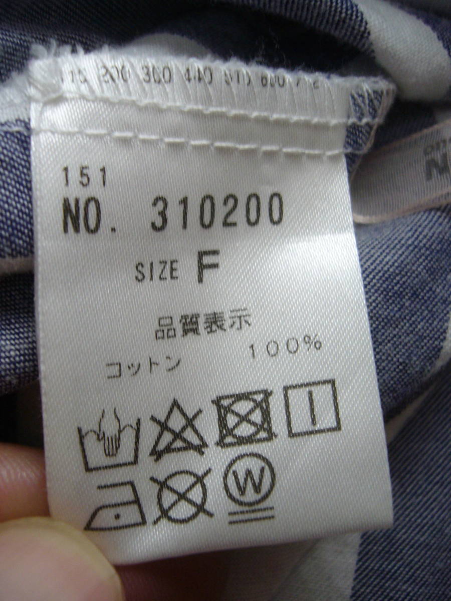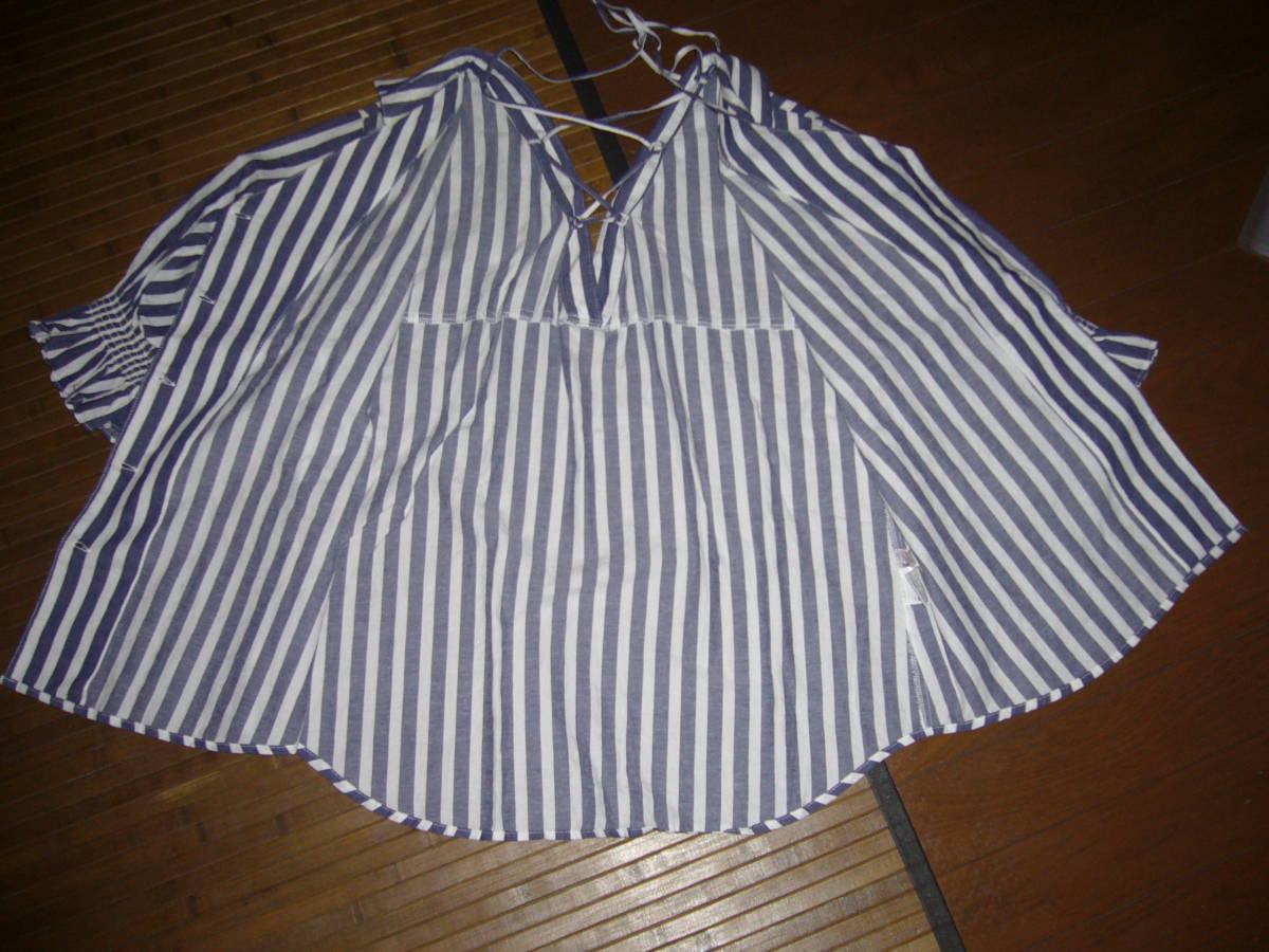 690-44♀:NICECLAUP ナイスクラップ かぶり デザインブラウス size.F 色.白青縦ストライプ
