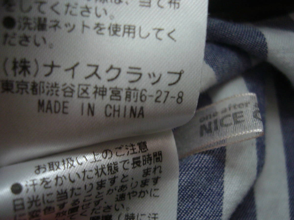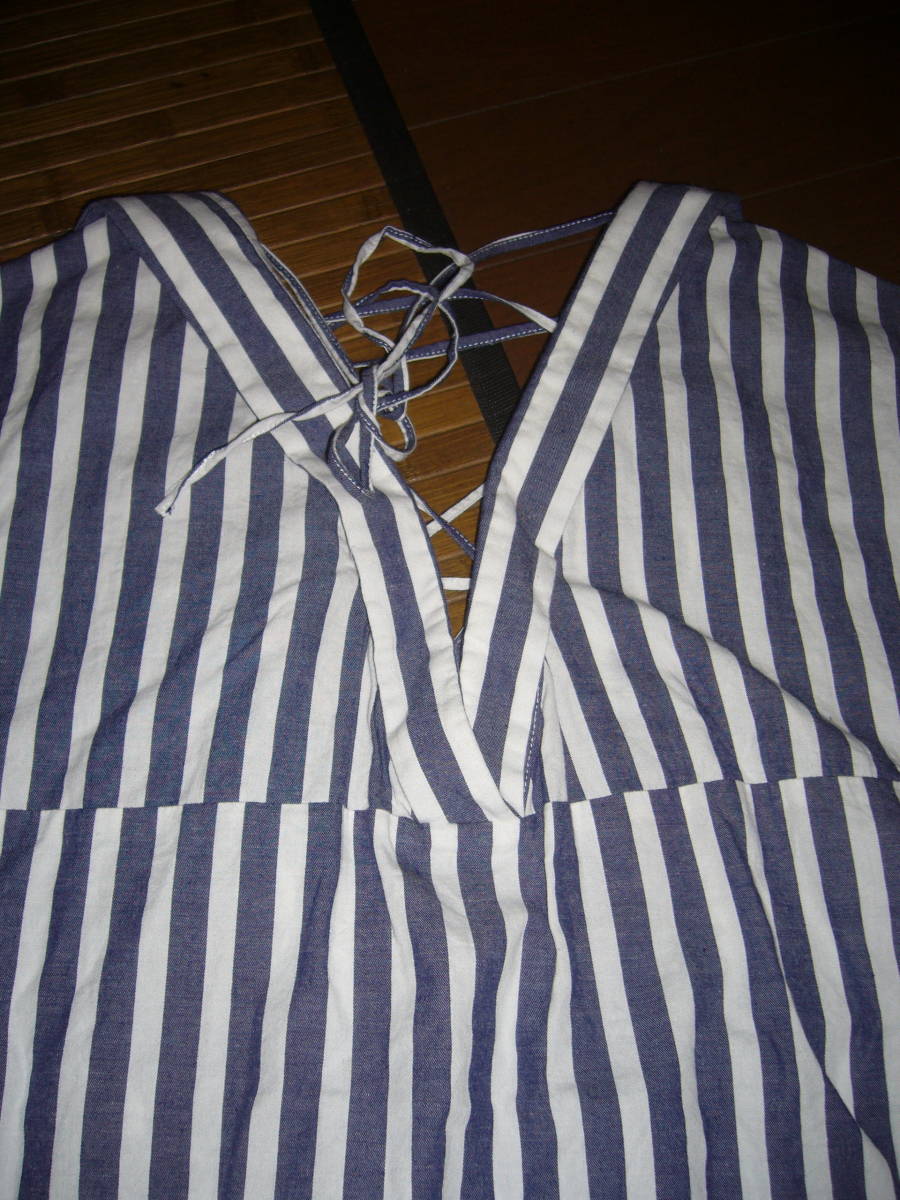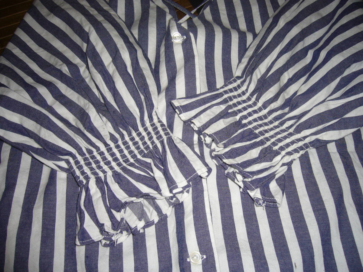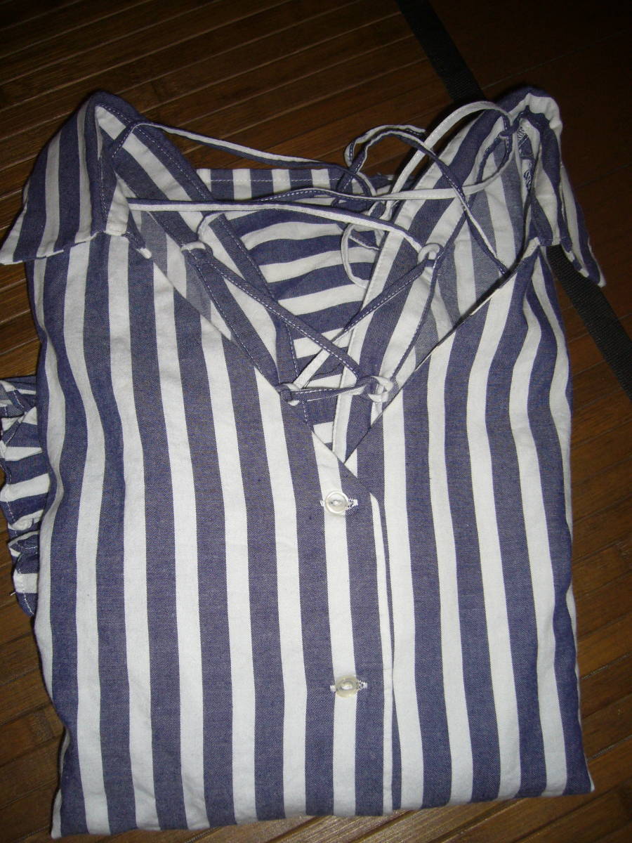 690-44♀:NICECLAUP ナイスクラップ かぶり デザインブラウス size.F 色.白青縦ストライプ