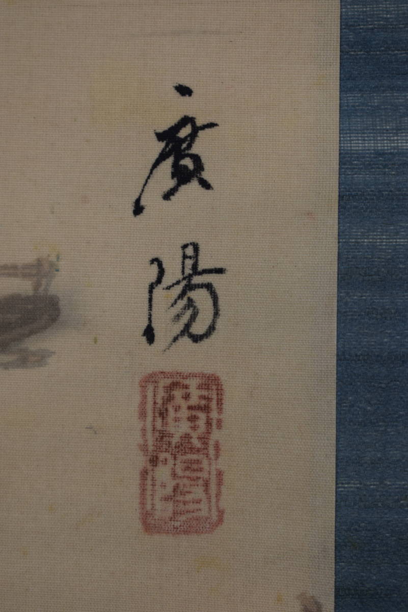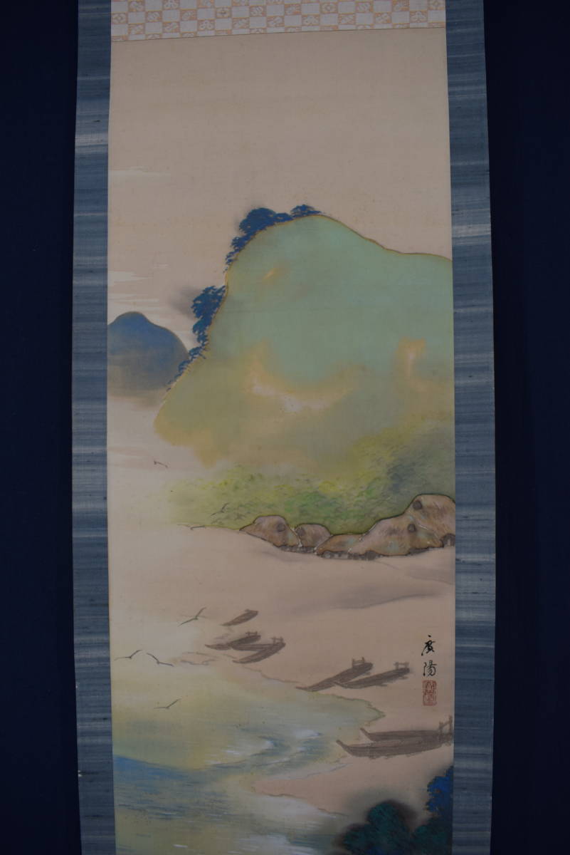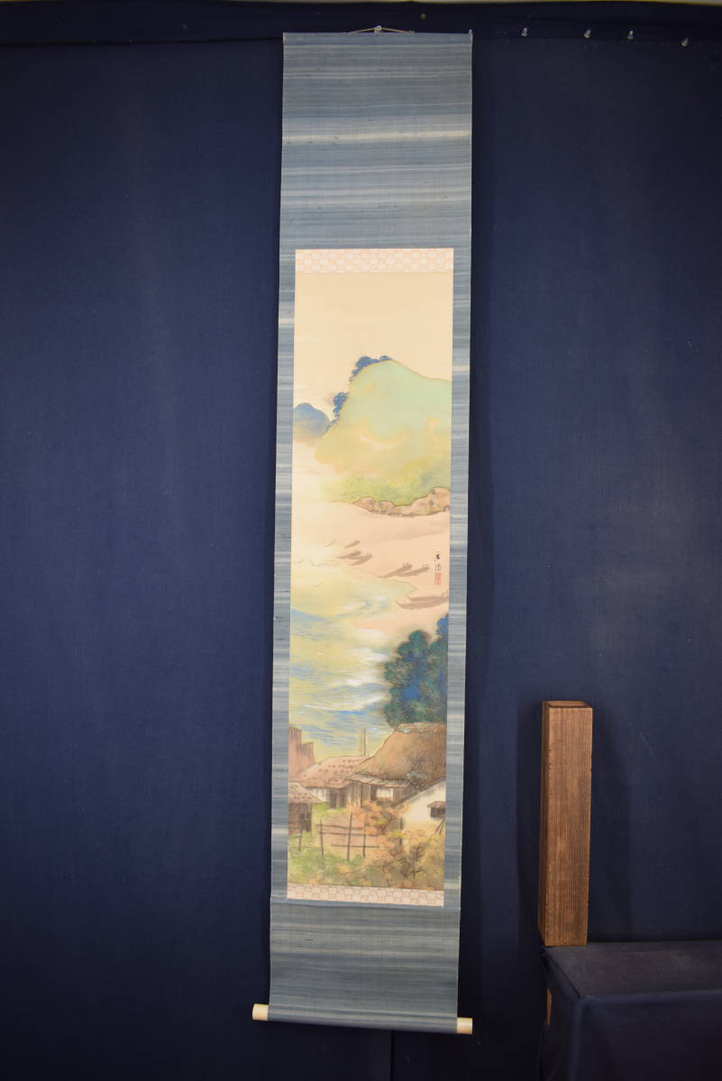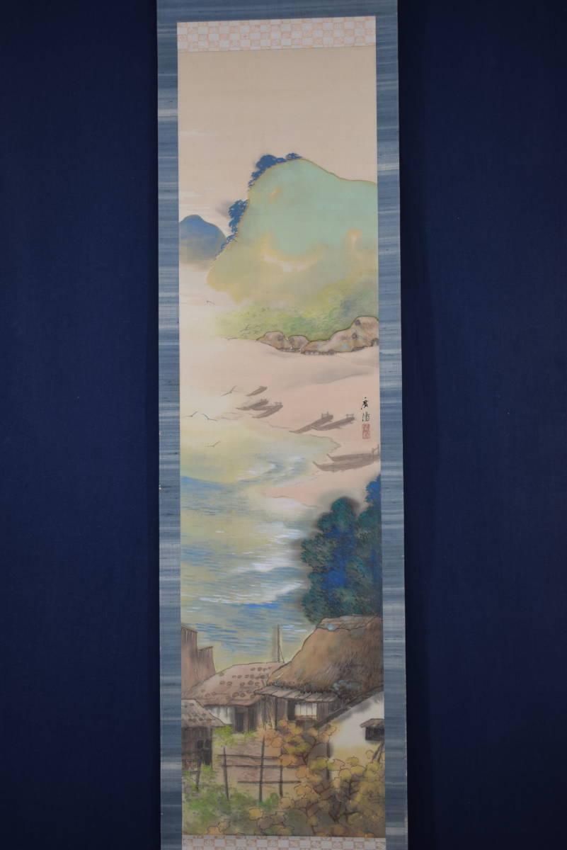 真作/大村廣陽/漁村風景図/青緑山水//掛軸☆宝船☆Y-506 JM