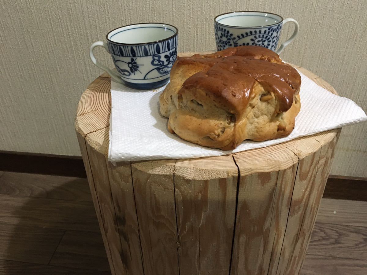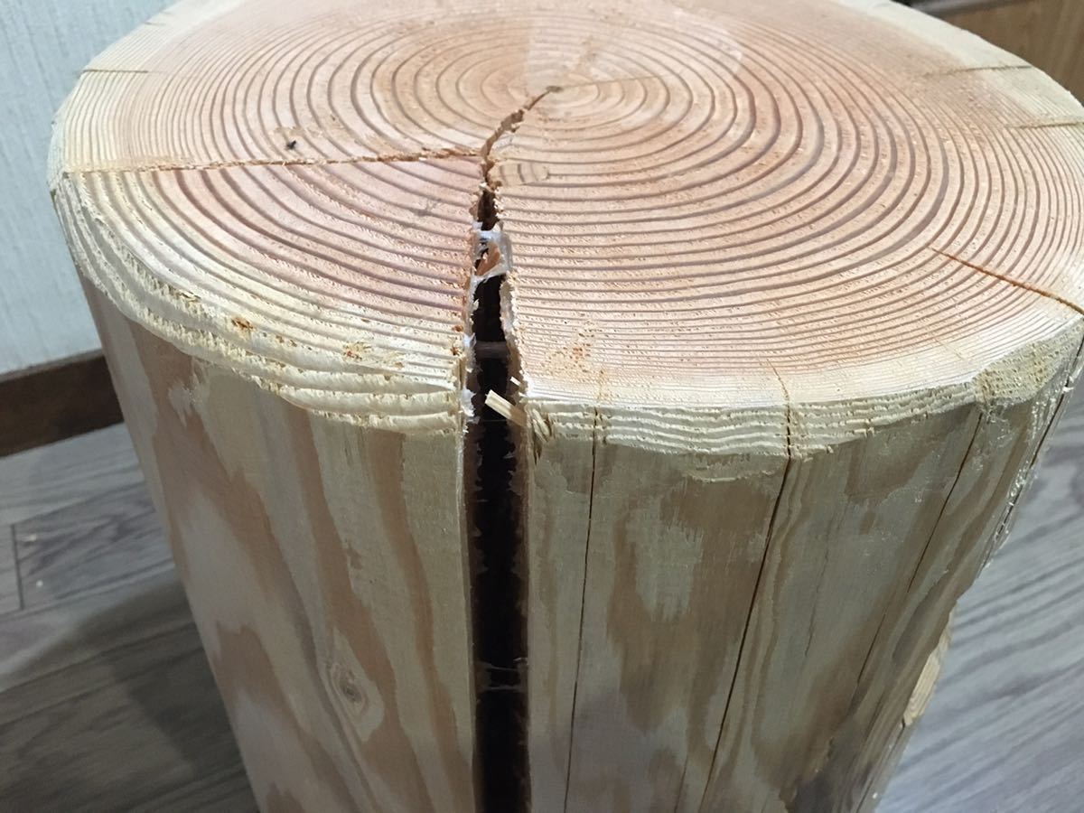 ログハウス部材でしたので、切込みが入れてあった箇所は木工用接着剤にて補修して丸太に戻してあります。