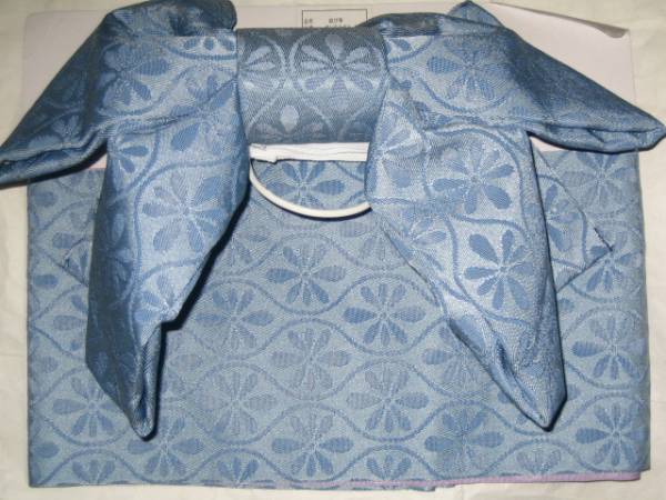 女性yukata用、地紋柄結び帯  くすみ空 ポリエステル  新品(織り地紋柄ありです。波状の写りはレンズの光学的ないたずらで現品にはありません、また薄く濃く写っている場合もあります)、胴部--帯巾約16,5cmx長さ約130cm、リボン部は横に約30cm。見た範囲で汚れないと思いますが、着用に差し支えない薄汚れ(多分ない?)はあってものお値段で出品です。