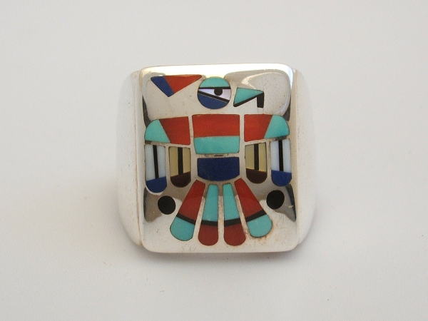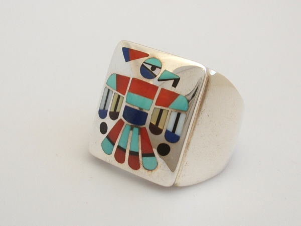 商品説明 | サンダーバードをインレイしたリングです。石はサンゴ、MOP、ラピス、TQです。 17、8年くらい前の作品です。 |