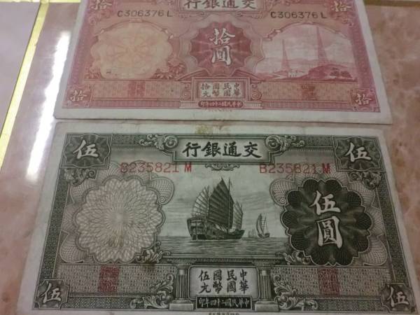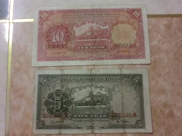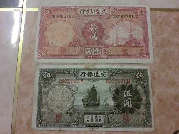 交通銀行 伍圓・拾圓の1935年を2種2枚です。