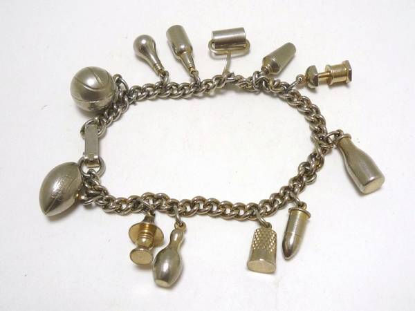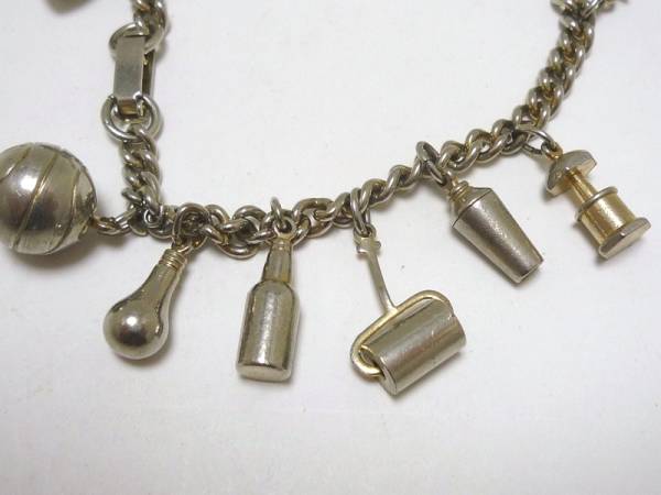 ■カクテルシェーカーやボール、ローラー、ビン、ボーリングピンなど、いっぱい飾りが付いているちょっと珍しいブレスレット。