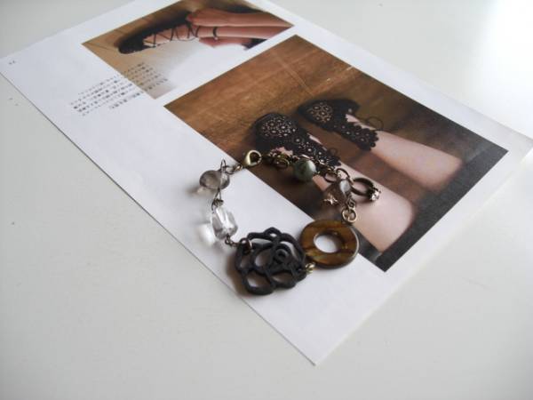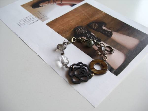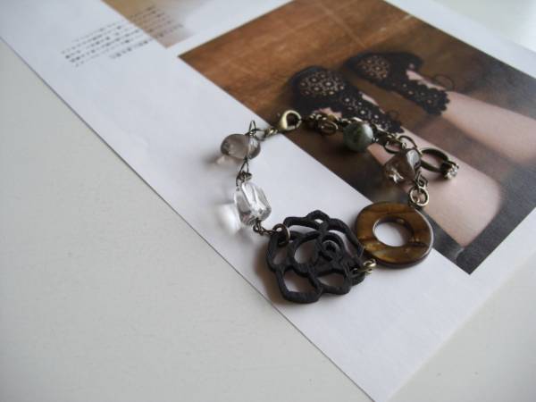 初夏のクローゼット・・シリーズです♪ターコイズと薔薇と・・シックなターコイズとウッドの薔薇のブレスレットです♪モスグリーンのターコイズに水晶やスモーキークォーツ、シェルリングを合わせてロマンチックな表情です♪ターコイズは8ミリの丸玉、ウッドの薔薇は25ミリ、水晶やスモーキークォーツはラフカットやオーバルツイストなどのデザイン違いです♪長さは全長23ンチ位で調節自由です♪お揃いのネックレスも出品しています。ハンドメイドをご理解頂いてノークレーム、ノーリターンでお願いします