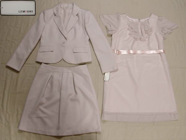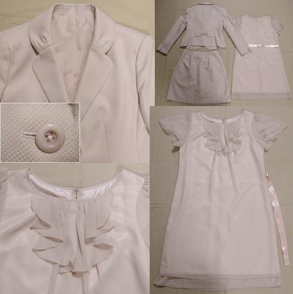 ジャケット、スカートは少し紫が入ったようなベージュ系で、ワンピースは少しピンクに近いベージュ系です。