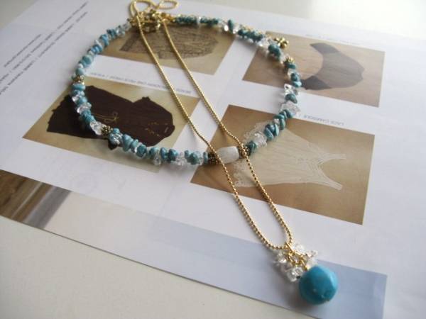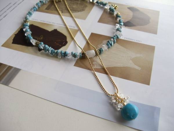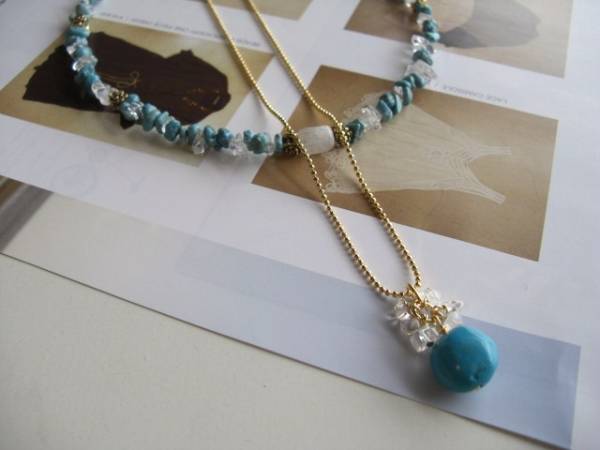 クレアの幸せ・・シリーズです♪初夏のターコイズ・・シックなターコイズのネックレス2点セットです♪ターコイズのさざれやタンブルに水晶やムーンストーン、薔薇のメタルチャームを添えてロマンチックな表情です♪水晶のさざれは6ミリから7ミリ位のさざれです♪水晶のさざれやムーンストーンのラフカット、薔薇のチャームを合わせました♪長さは全長42センチくらいです♪13ミリ位のタンブルのターコイズは水晶のさざれでおめかししました♪長さは66センチ+アジャスター12センチで最長78センチくらいです♪単品やブレスレットも出品しています♪シンプルで長く着けていただけるデザインを考えて作りました!ハンドメイドをご理解頂いてノークレーム、ノーリターンでお願いします