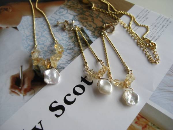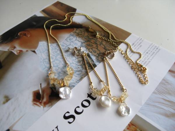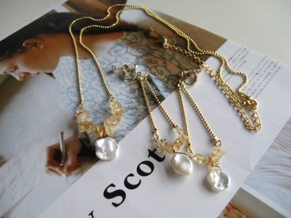 クレアの幸せ・・シリーズです♪やさしい芥子パール・・繊細なオフホワイトの芥子パールとシトリンのネックレスとイヤリングの2点セットです♪イヤリングはピアスにも変更出来ます♪花びらのような芥子パールに琥珀色のシトリンや華奢なカット入りのボールチェーンを合わせて可憐な表情です♪ネックレスは13ミリ位の芥子パールにさざれのシトリンを合わせました♪長さは68センチ+アジャスター12センチで最長80センチ位です♪イヤリングは10×12ミリ位の芥子パールにシトリンを合わせました♪長さは9センチ位です♪ピアスにも変更出来ます♪お揃いのブレスレットも出品しています♪シンプルで飽きのこないいつまでも着けられるデザインを考えて作りました♪ハンドメイドをご理解頂いてノークレーム、ノーリターンでお願いします