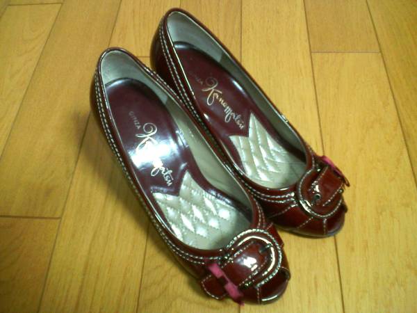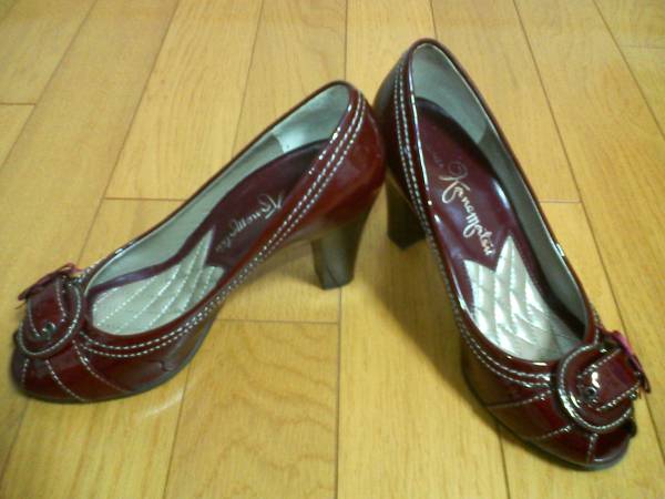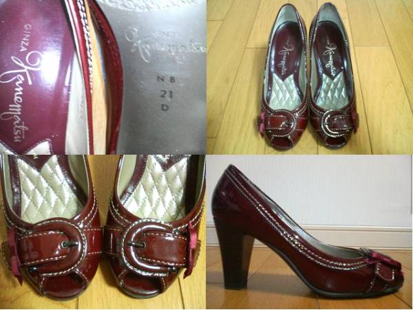 即決 銀座かねまつ パンプス 21cm バックル リボン飾り オープントゥ ボルドー赤