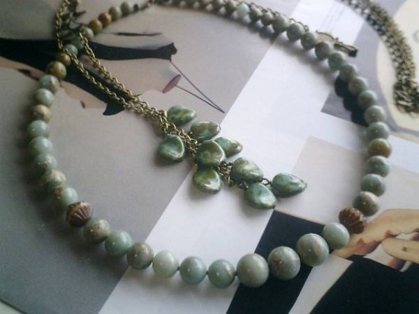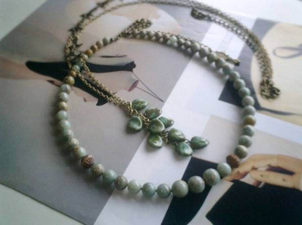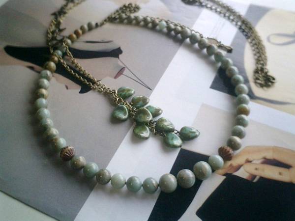 天使の時間・・シリーズです♪巴里の夕暮れ・・シックなアンティークグリーンのインプレッションストーンとチェコビーズのネックレス2点セットです♪やさしいモスグリーンのストーンやチェコビーズに小鳥さんのデザインチェーンを合わせてロマンチックな表情です♪6ミリ、8ミリ、10ミリのグラデーションのストーンのネックレスにはデザインチェコを合わせました♪長さは46センチ+アジャスター14センチで最長60センチ位です♪12×9ミリのチェコビーズには小鳥さんのデザインチェーンを合わせました♪長さは78センチ+アジャスター13センチで最長91センチ位です♪トップは7センチ位です♪それぞれ単品やブレスレットやイヤリングも出品しています♪シンプルで飽きのこないいつまでも着けられるデザインを考えて作りました!ハンドメイドをご理解頂いてノークレーム、ノーリターンでお願いします