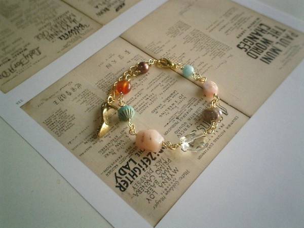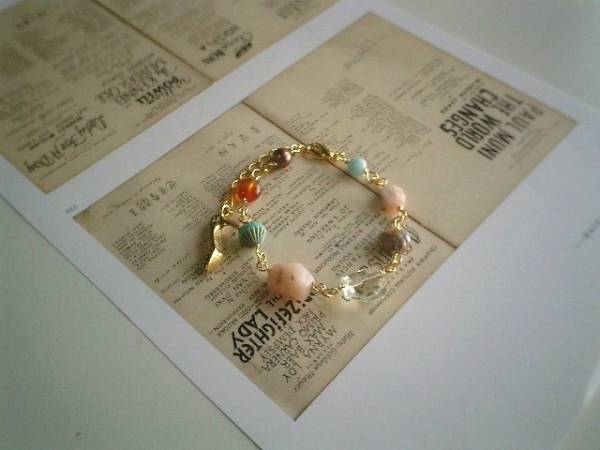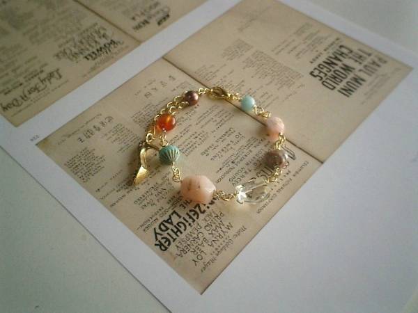 コゼットの裁縫箱・・シリーズです♪やさしいピンク・・繊細で神秘的な石を集めてシックなブレスレットです♪6ミリから15ミリ位までのランダムカットやラフカットや丸玉などのピンクオパールやレモン水晶、カーネリアン、アマゾナイト、芥子パール、チェコビーズなど透明感のある石を合わせてさりげなく華やかです♪長さは全長23センチ位で調節自由です♪お揃いのネックレスも出品しています♪シンプルで飽きのこないいつまでも着けられるデザインを考えて作りました!ハンドメイドをご理解頂いてノークレーム、ノーリターンでお願いします
