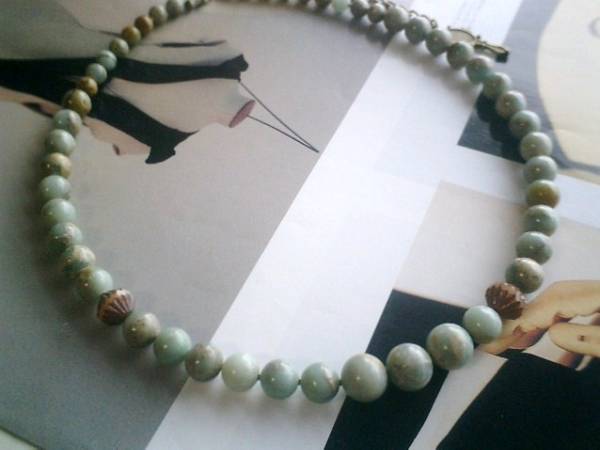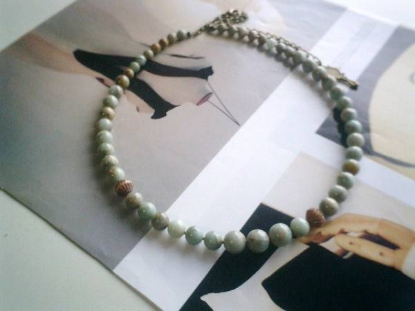 天使の時間・・シリーズです♪巴里の夕暮れ・・シックなアンティークグリーンのインプレッションストーンのネックレスです♪やさしいモスグリーンのストーンにチェコビーズを合わせてロマンチックな表情です♪6ミリ、8ミリ、10ミリのグラデーションのストーンのネックレスにはデザインチェコを合わせました♪長さは46センチ+アジャスター14センチで最長60センチ位です♪お揃いのネックレスやブレスレットやイヤリングも出品しています♪シンプルで飽きのこないいつまでも着けられるデザインを考えて作りました!ハンドメイドをご理解頂いてノークレーム、ノーリターンでお願いします