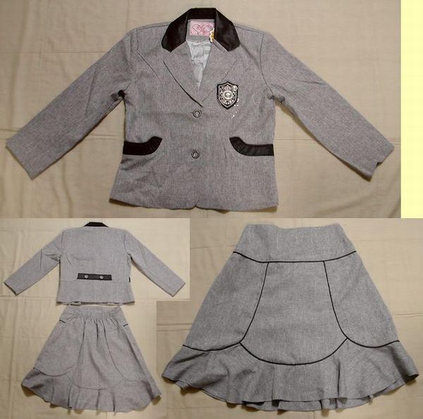 表示サイズ:150cm 素人平置き採寸:[ジャケット]身幅45、着丈53、肩幅38、袖丈49 [スカート]ウエスト(後がゴム)33~、丈52