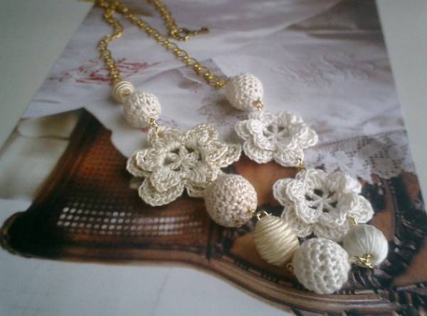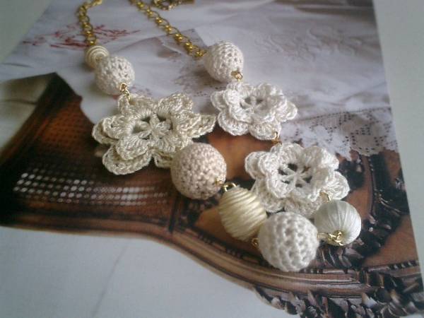 コゼットの裁縫箱・・シリーズです♪やさしい夢を見て・・ふんわりやさしいオフ・ホワイトのネックレスです♪編みフラワー、樹脂薔薇や編みボールやサテンボール、彫りボーンなどを集めてロマンチックな表情です♪12ミリから43ミリ位までのサテンボールや編みボール、編みフラワーを合わせました♪長さは全長70センチ位で調節自由です♪ホワイト・ベージュ色でまとめてふんわりやさしい表情です♪お揃いのネックレスやブレスレットも出品しています♪シンプルで飽きのこないいつまでも着けられるデザインを考えて作りました!ハンドメイドをご理解頂いてノークレーム、ノーリターンでお願いします