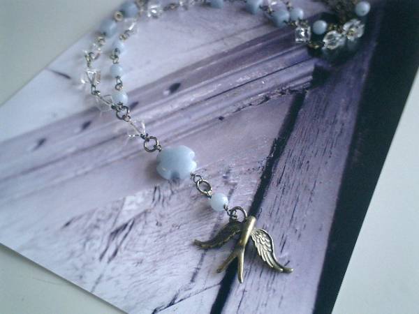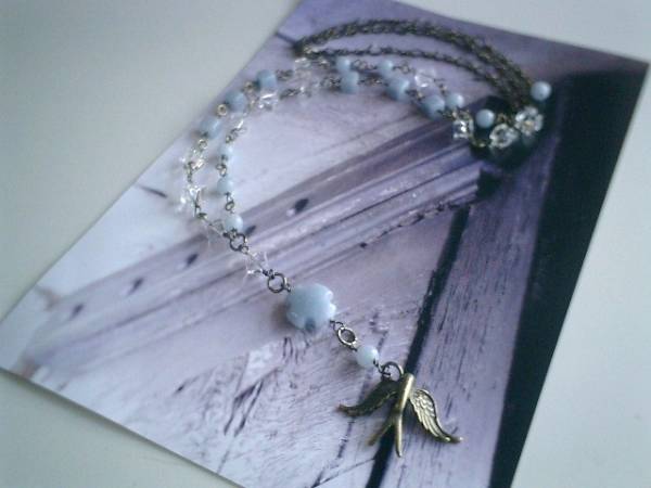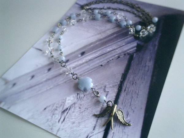 秋の小鳥さん・・シリーズです♪天使とつばめさん・・繊細なブルーが素敵なエンジェライトとつばめさんの可憐なネックレスです♪天使の石と呼ばれるエンジェライトは6ミリから12ミリ位までの丸玉やスクエア、クロスカットなどのデザイン違いです♪水晶やつばめさんのチャームを合わせてアンティーク・モダンしています♪長さは全長80センチ位で調節自由です♪トップは9センチ位です♪シンプルで飽きのこないいつまでも着けられるデザインを考えて作りました!お揃いのブレスレットも出品しています♪ハンドメイドをご理解頂いてノークレーム、ノーリターンでお願いします