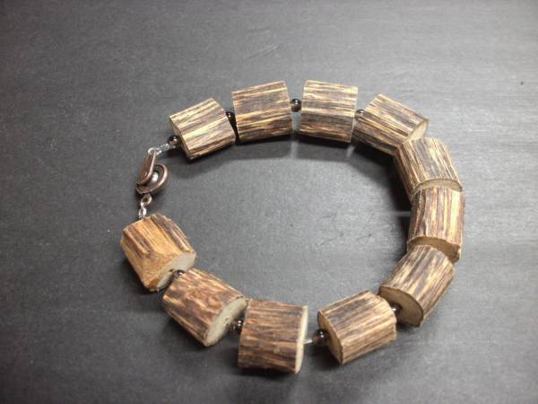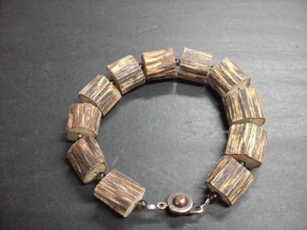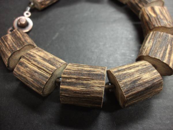 | えもいわれぬ香りの沈香を贅沢に13gも使ってブレスレットを作りました。沈香で管を作り連続して連ねて間にスモーキークォーツの小さな玉を挟んで素朴なブレスレットに仕立てました。 重さ:13g この度は思い切った値段にしました。 |