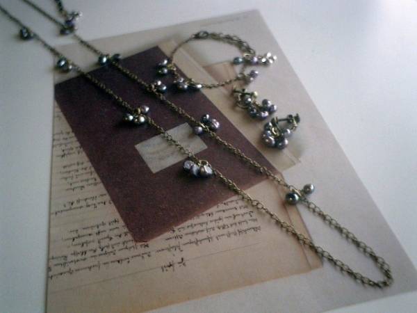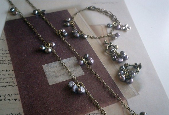 ガールズ・レッスン・・シリーズです♪シックなパールを集めて・・グレーパープルの淡水パールのネックレス、ブレスレット、イヤリングの3点セットです♪5ミリから6ミリ位のバロックの淡水パールを繊細なチェーンに繋いでロマンチックな表情です♪ネックレスの長さは72センチ+アジャスター10センチで最長82センチ位です♪ブレスレットの長さは16センチ+アジャスター6センチで最長22センチ位です♪イヤリングは全長2センチ位です♪ピアスにも変更出来ます♪シンプルで飽きのこないいつまでも着けられるデザインを考えて作りました!ハンドメイドをご理解頂いてノークレーム、ノーリターンでお願いします
