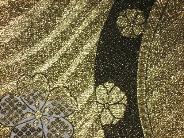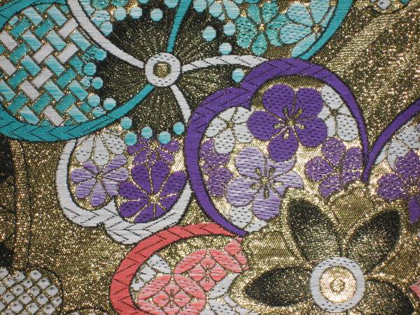なお、帯柄左上に無地で出ているところは裏無地で、柄と柄の間に出ているところは手先と前太鼓のあいだの無地部分です。六通柄です。金銀糸が多用されているためストロボの照りで、しろぽく写っている部分があります