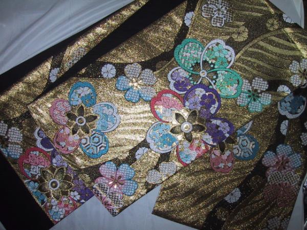 黒金+金地(裏地くろ)かいきり(たれ先柄立ち上がり)~かいきり(手先柄はし)まで約455,5cmですので、出来上がり予想は約452cmです。巾31,1cm 2424
