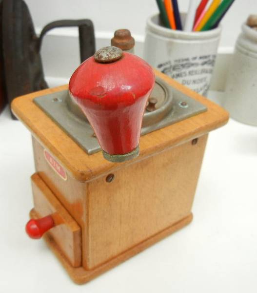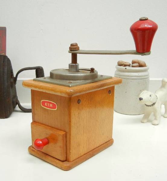 イギリスの蚤の市で見つけてきた KYM社のコーヒーグラインダーです。 赤いツマミがとてもカワイイです。 キッチン周りのインテリアのアクセントに オススメです。 中の状態はさびやコーヒーのカスが付いていたりします。 外観は大きなダメージなくコンディション良好です。 寸法 幅9.5cm 高さ19cm(取っ手含む) 奥行き12cm 年代 1960年代 アンティークの為お客様との見解の相違が多少あるかと思いますが ご理解の上、ご入札よろしくお願い致します。 | |||||