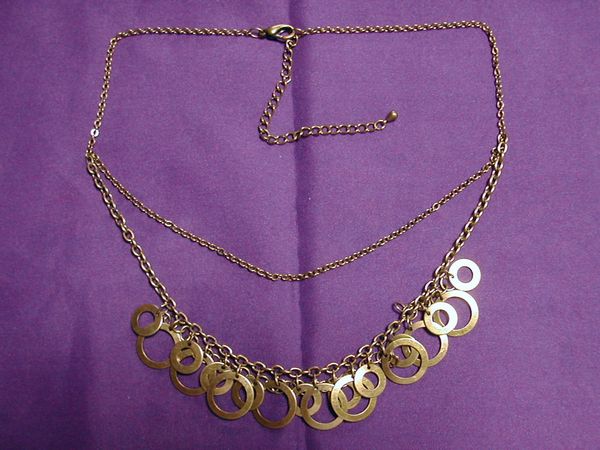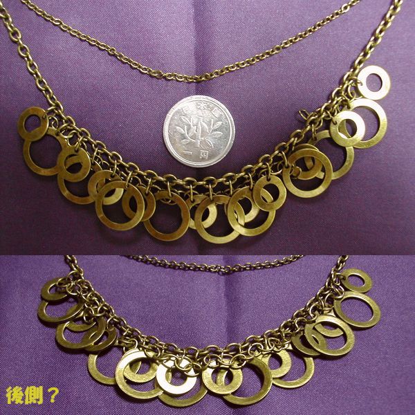 ブロンズ色?のチェーンに沢山のリングを付けたデザインネックレスです。
