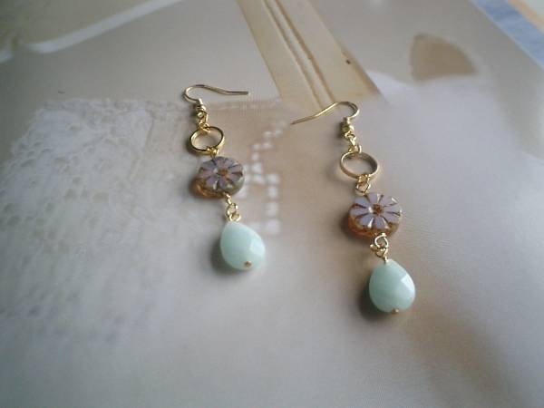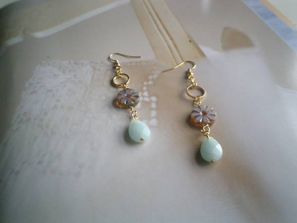 ビター・スィート・・シリーズです♪水色のワンピース・・可憐なアマゾナイトのピアスです♪15×10ミリのフラットドロップカットのアマゾナイトに透かし模様のチェコビーズやデザインリングを合わせました♪長さは全長7・5センチ位です♪イヤリングに変更出来ます♪お揃いのピアスやネックレスやブレスレットも出品しています♪シンプルで長く着けていただけるデザインを考えて作りました♪ハンドメイドをご理解頂いてノークレーム、ノーリターンでお願いします
