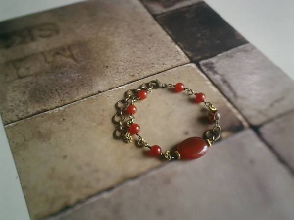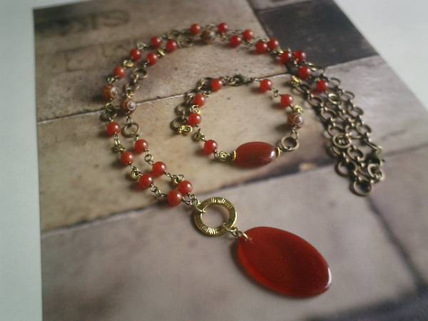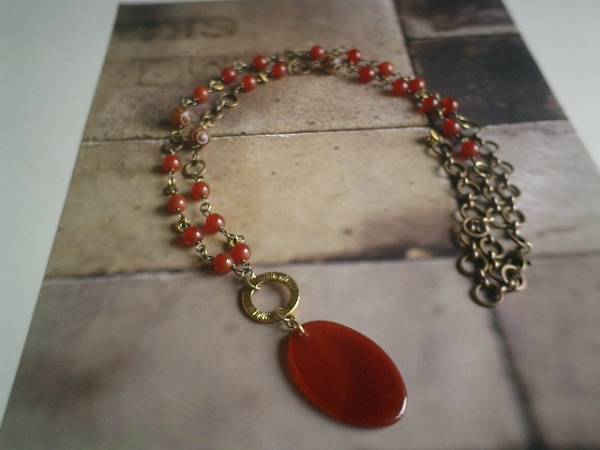 お気に入りのフォルム・・シリーズです♪オリエンタル気分・・シックなカーネリアンのネックレスとブレスレットです♪ダークオレンジのカーネリアンに唯玉やデザインチェーンを合わせてオリエンタル・モダンしています♪カーネリアンは6ミリの丸玉、唯玉は8ミリ位です♪ネックレスの長さは全長73センチ位で調節自由です♪トップは35ミリ×22ミリ位のフラットオーバルのカーネリアンです♪ブレスレットは6ミリの丸玉、18×13ミリ位のフラットオーバルのカーネリアンです♪全長23センチ位で調節自由です♪それぞれ単品やピアスも出品しています♪シンプルで飽きのこないいつまでも着けられるデザインを考えて作りました!ハンドメイドをご理解頂いてノークレーム、ノーリターンでお願いします