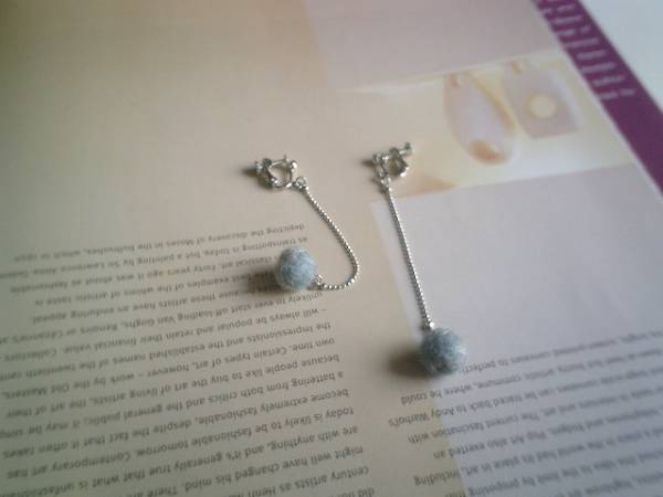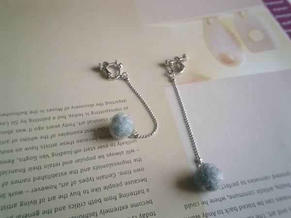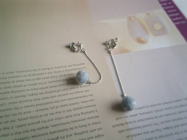 お気に入りのフォルム・・シリーズです♪水色に恋して・・ふんわりやさしいフェルト玉のイヤリングです♪ブルーグレーの小さなフェルト玉を繋いでシンプルなデザインです♪フェルト玉は11ミリ位です♪華奢なボールチェーンを合わせました♪長さは全長9センチ位です♪ピアスにも変更出来ます♪お揃いのネックレスやブレスレットも出品しています♪シンプルで飽きのこないいつまでも着けられるデザインを考えて作りました!ハンドメイドをご理解頂いてノークレーム、ノーリターンでお願いします |