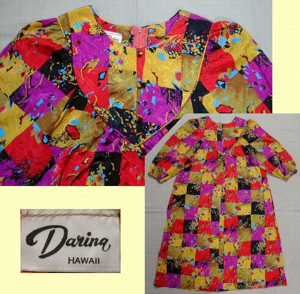 ■美品:ハワイアンなカラフル薄手ワンピース 七分袖 USA製 DmV16
