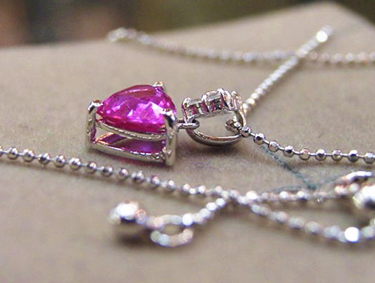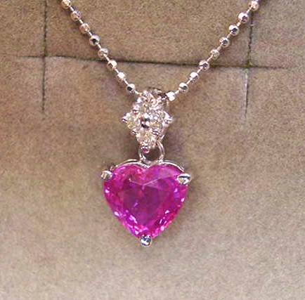 ♪赤色にピンク色が入った上質で色の良い【ハート型】にカットされた【天然ルビー・1.36c】を【K18WG・天然ダイヤモンド・0.08c入り】ペンダント枠に留められています。シンプル・上品で飽きの来ないデザインは、年齢を問わず、どなたにも合います。(7月生まれの方の誕生石でもあります。)