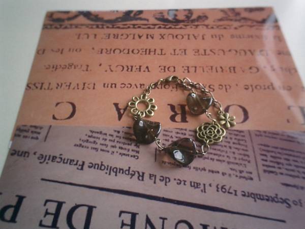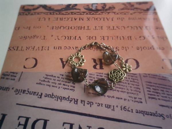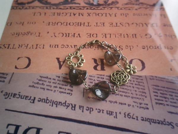 ジゼルの宝石箱・・シリーズです♪大人色のダークブラウン・・繊細なスモーキークォーツのブレスレットです♪薔薇のチャームを合わせてロマンチックな表情です♪スモーでキークォーツは15ミリ位のコインツイストです♪長さは全長23センチ位で調節自由です♪♪お揃いのネックレスも出品しています♪シンプルで飽きのこないいつまでも着けられるデザインを考えて作りました!ハンドメイドをご理解頂いてノークレーム、ノーリターンでお願いします