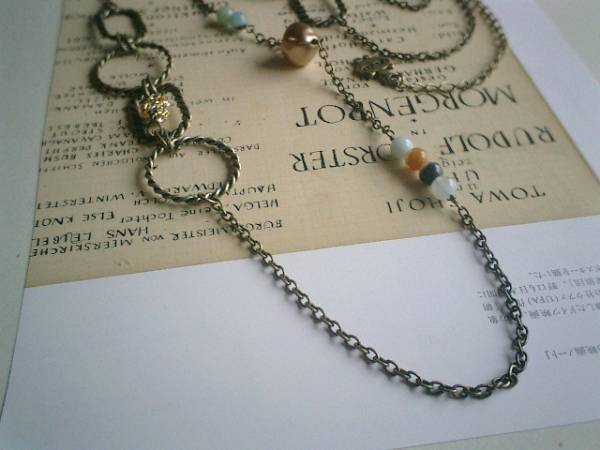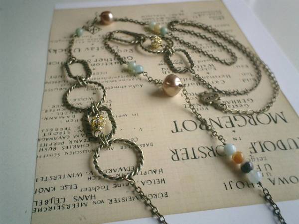 エスニック・気分・・シリーズです♪フレンチ・レシピ・・個性的なモチーフを集めたネックレスです♪シックなアマゾナイトやチェコパール、ジルコニアボールやデザインリングがキュートな表情です♪アマゾナイトは6ミリの丸玉、ジルコニアボールは8ミリ、チェコパールは10ミリ位です♪長さは93センチ+アジャスター17センチで最長110センチ位です♪2連にされても素敵です♪お揃いのブレスレットも出品しています♪シンプルで飽きのこないいつまでも着けられるデザインを考えて作りました!ハンドメイドをご理解頂いてノークレーム、ノーリターンでお願いします |